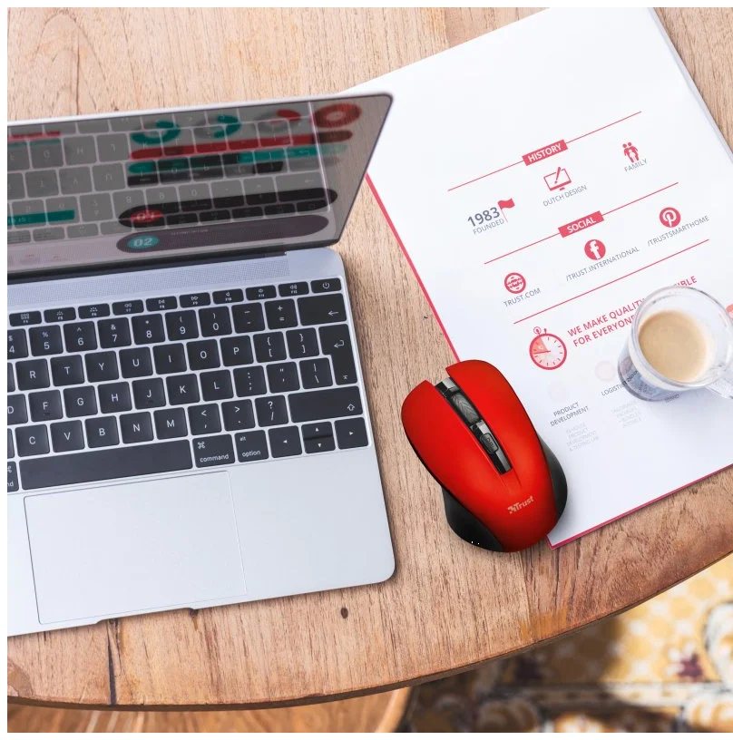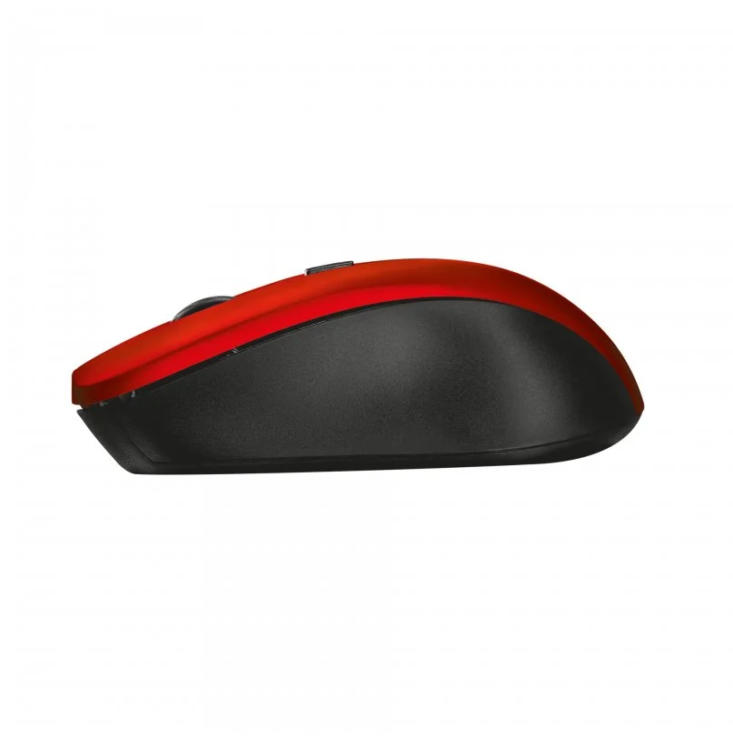 Cómodo ratón inalámbrico Mydo Silent Click de Trust con modernas teclas silenciosas, en color rojo.