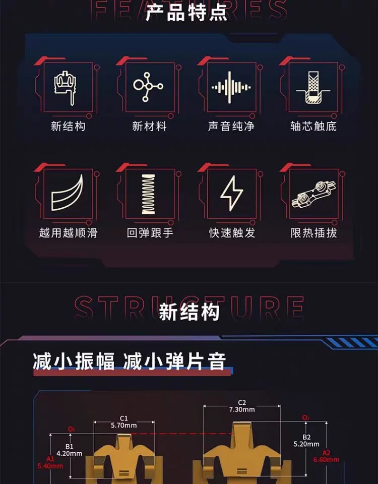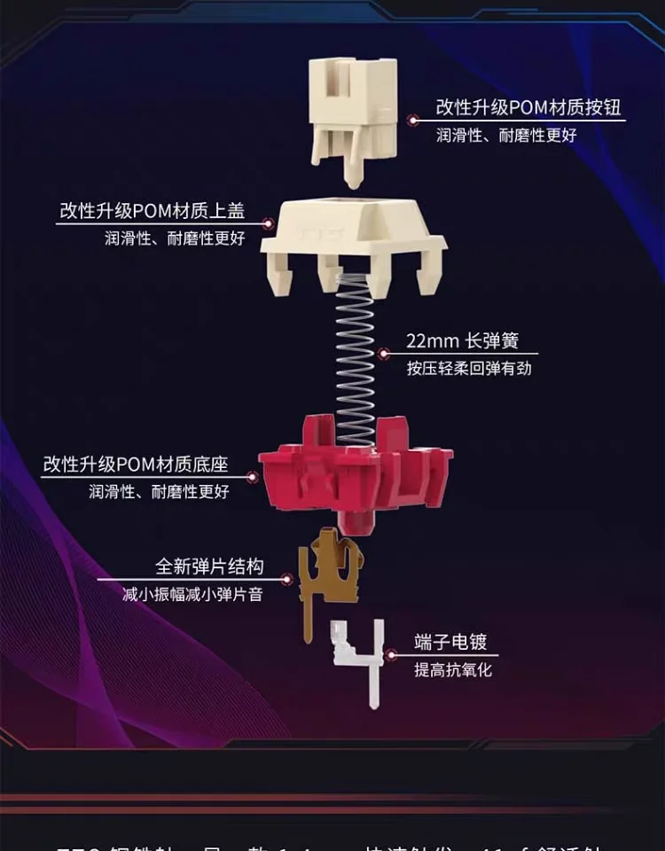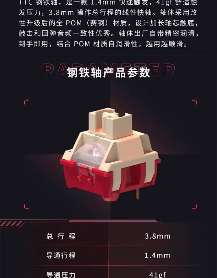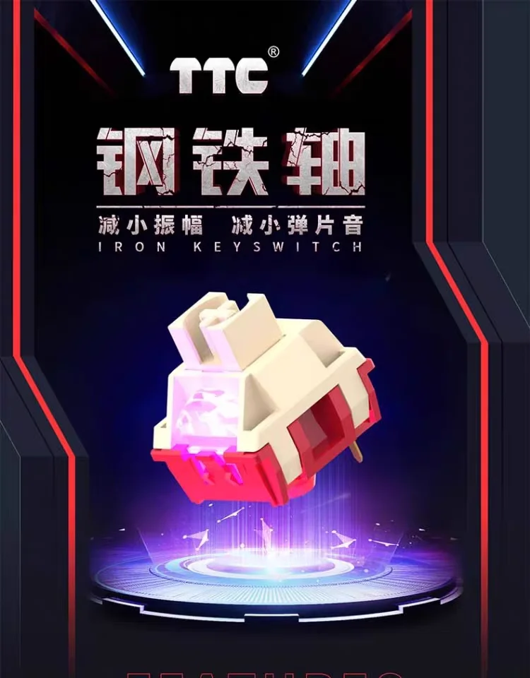 3. El interruptor de hierro TTC es un gatillo rápido de 1,4mm, 41GF de presión de gatillo cómoda, 3,8mm de carrera total operativa del interruptor rápido lineal. El cuerpo del eje adopta material POM completo modificado y actualizado, y el diseño y la consistencia del audio de rebote y el golpeteo inferior del vástago de extensión son excelentes. El cuerpo del eje viene con lubricación de precisión lista para uso manual, combinada con autolubricación de material POM, cuanto más se usa, más suave es.