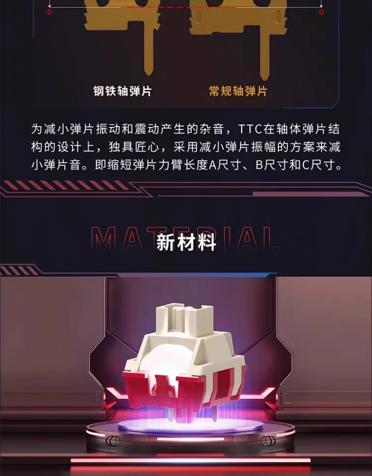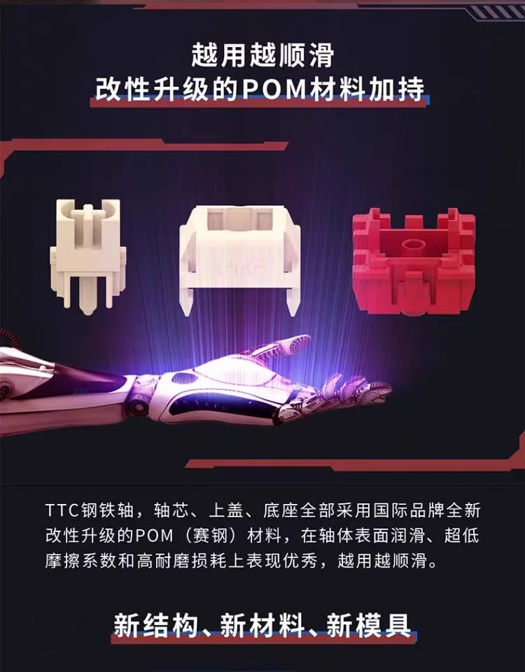 El vástago del interruptor, la cubierta superior y la base del interruptor de hierro TTC son materiales POM modificados y mejorados de marcas internacionales, que funcionan bien en la lubricación de la superficie, coeficiente de fricción ultra bajo y alta pérdida de desgaste del cuerpo del interruptor, y cuanto más se usa, más suave es.
