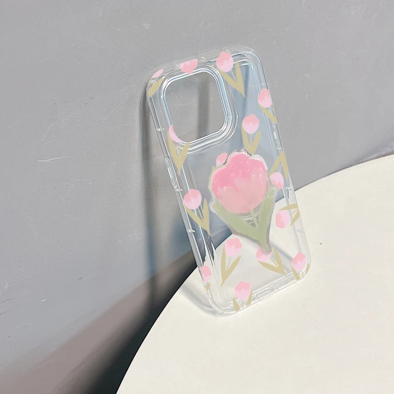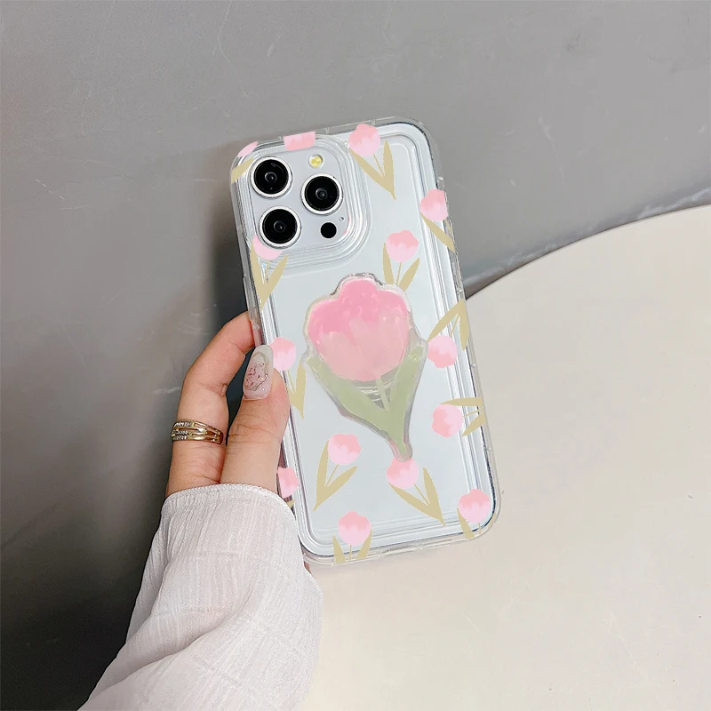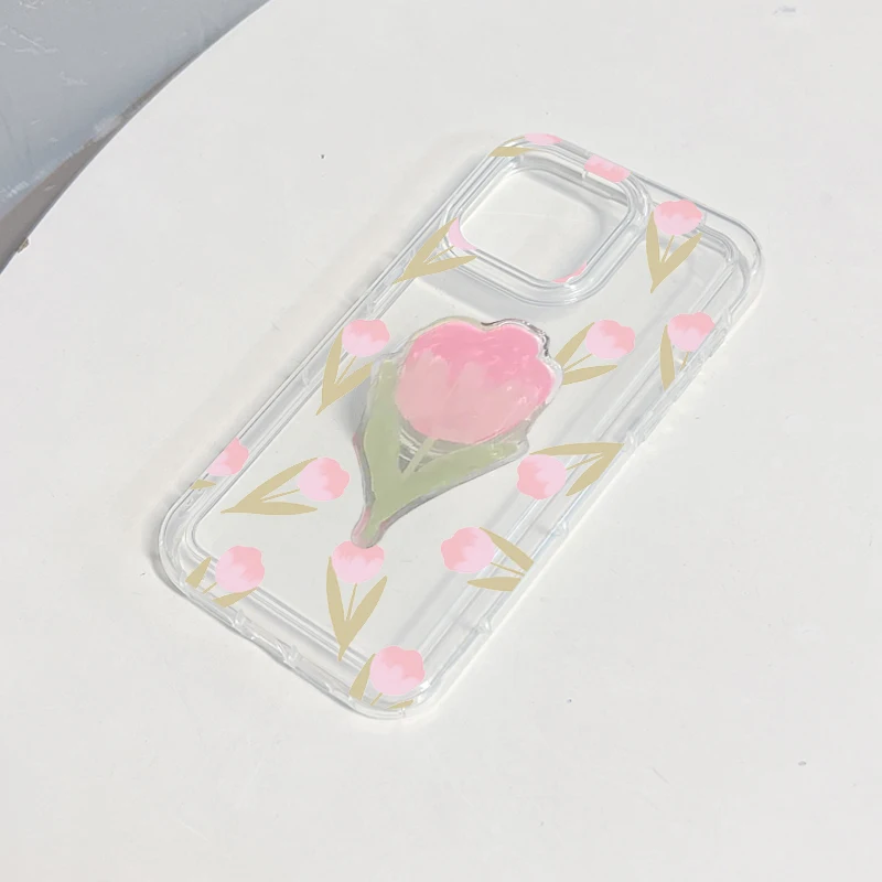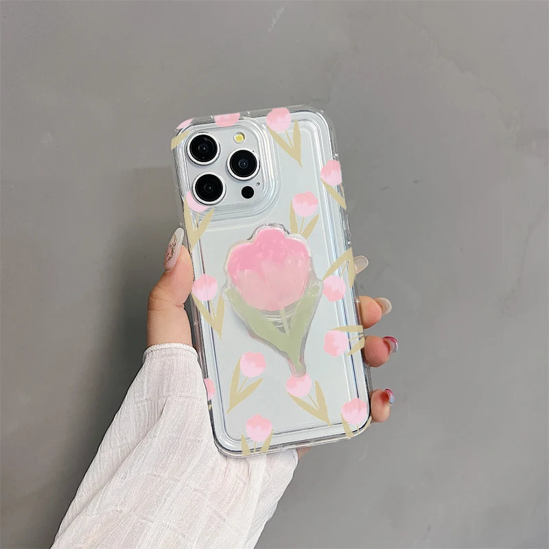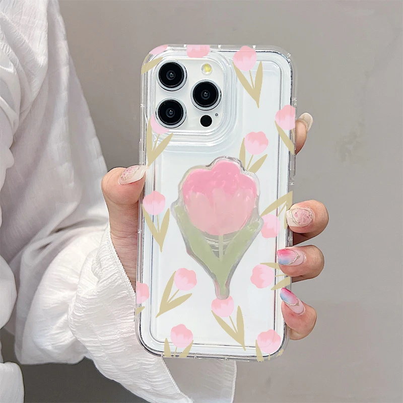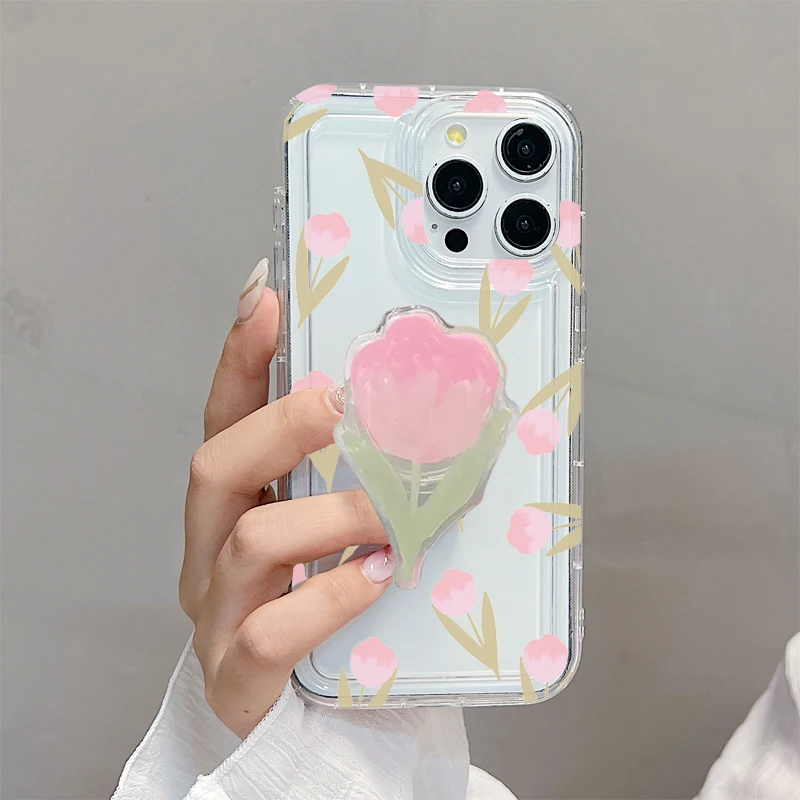 Tulip Grip Holder Phone Case For iPhone 15 14 13 12 11 16 Pro Max SE XR X XS 7 8 Plus Stand Flower Clear Shockproof Soft Cover