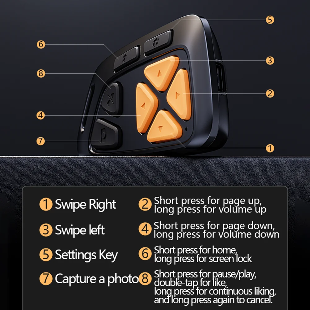 4.Durabilidad y portabilidad premium:Fabricado con materiales ABS+PC, este control remoto de desplazamiento de video es resistente a caídas, al sudor y a la presión, lo que ofrece un agarre cómodo.Cuenta con una batería recargable incorporada de 150 mAh, que proporciona más de 10.000 clics fotográficos con una sola carga de 30 minutos.Su diseño compacto y liviano hace que sea fácil de transportar y usar mientras viaja.Con una conexión sencilla con un solo botón, simplemente encienda el Bluetooth de su teléfono, empareje rápidamente y disfrute del desplazamiento de videos y libros electrónicos con manos libres.