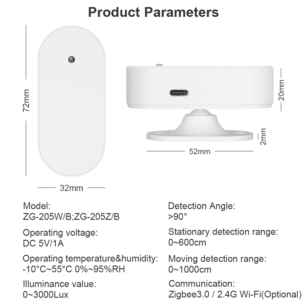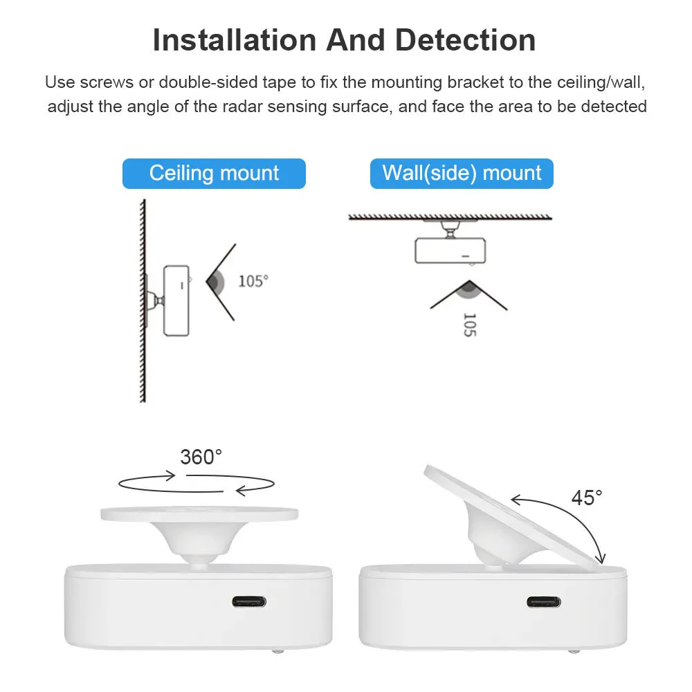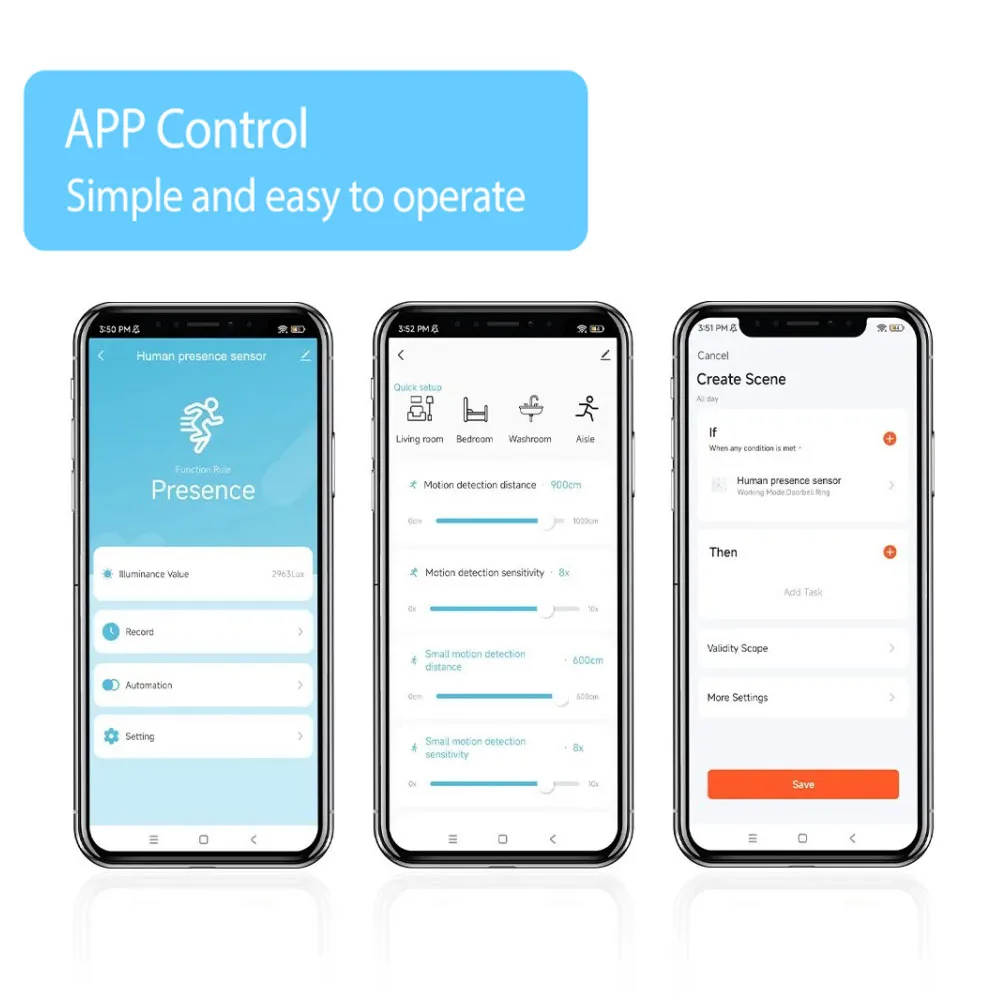 Destacado como presencia humana, estática humana, Micro movimiento humano y detección de movimiento humano para detectar la presencia o ausencia de personas en el área, incluso para detectar el estado estático, como el personal que duerme con precisión, con detección de radar de ondas milimétricas.
