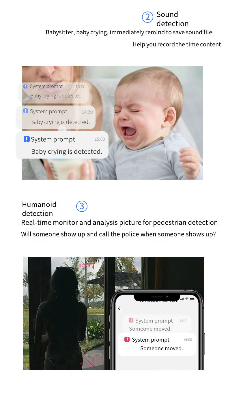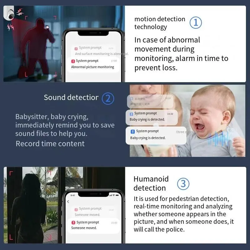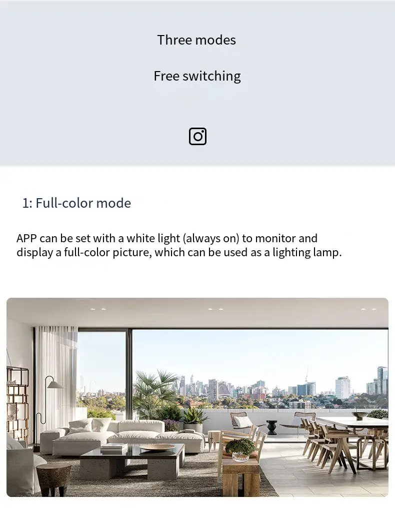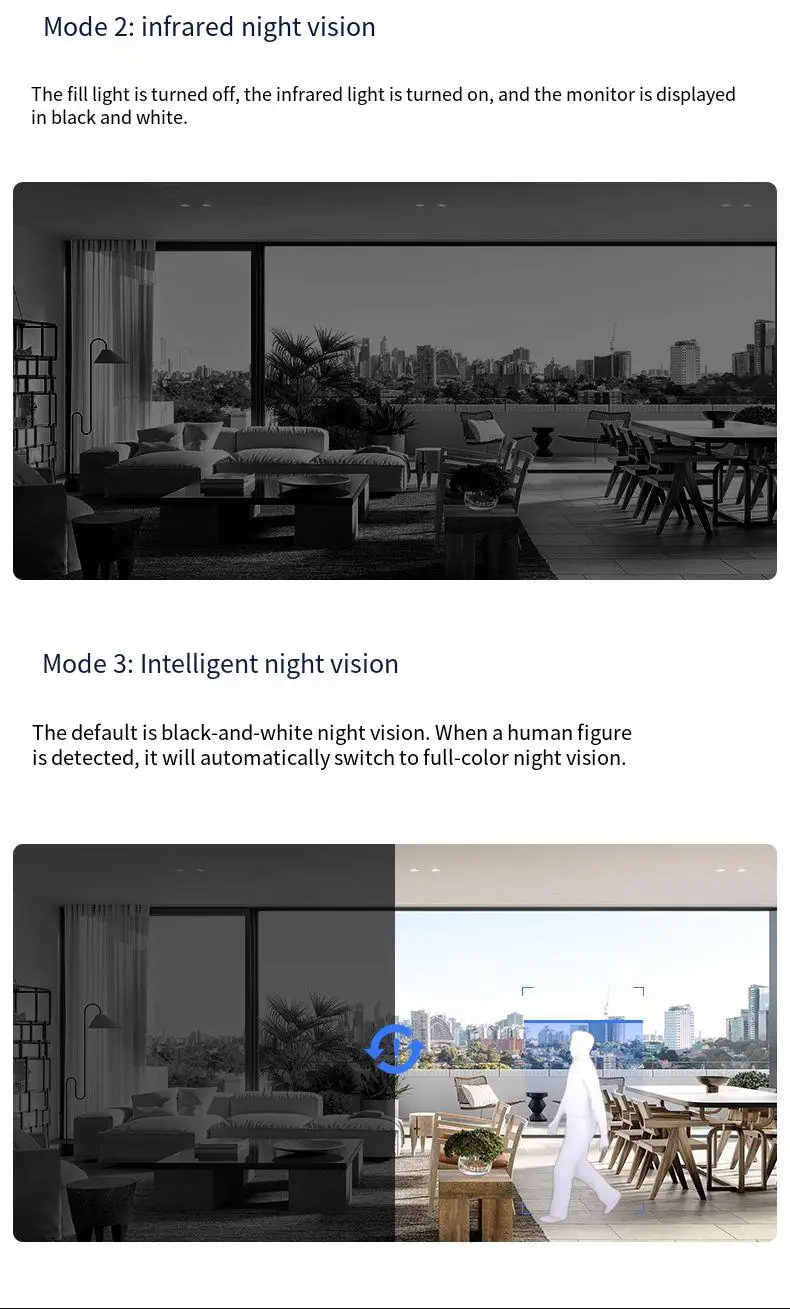 Admite luz blanca a todo color, la visión nocturna en color es clara; Vista previa de tres modos, luz blanca a todo color, visión nocturna infrarroja, advertencia de doble luz.