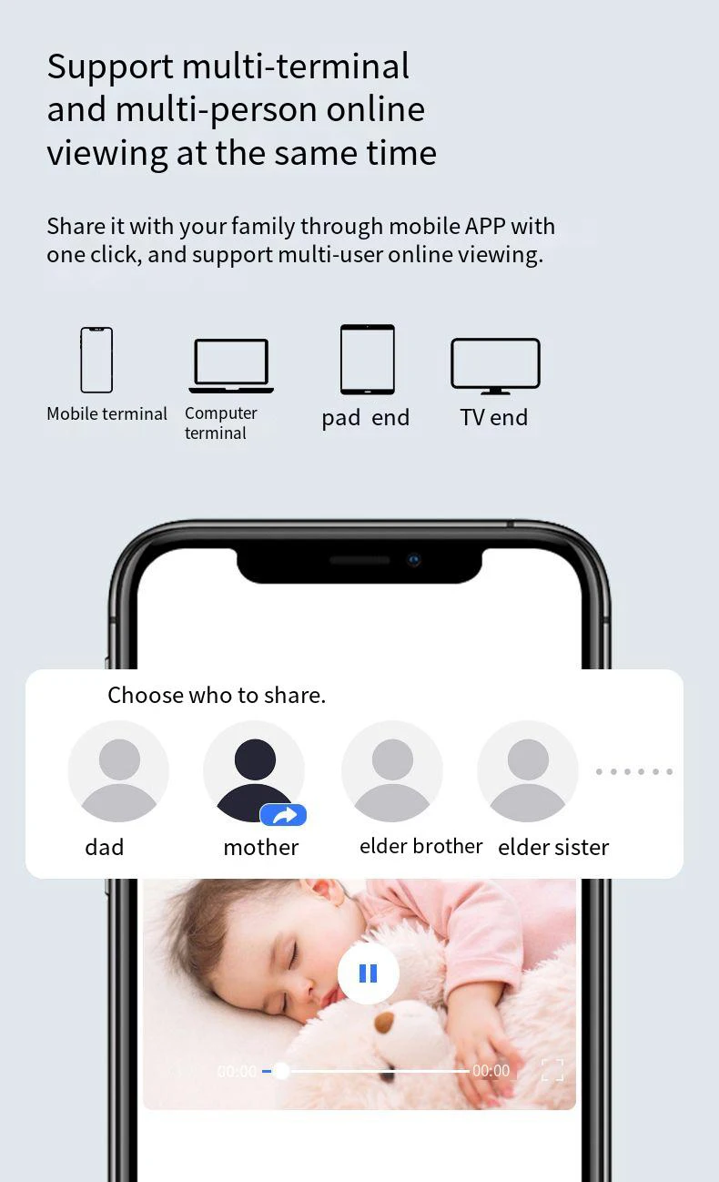 Compártelo con tu familia a través de la aplicación móvil con un solo clic y admite visualización en línea multiusuario.