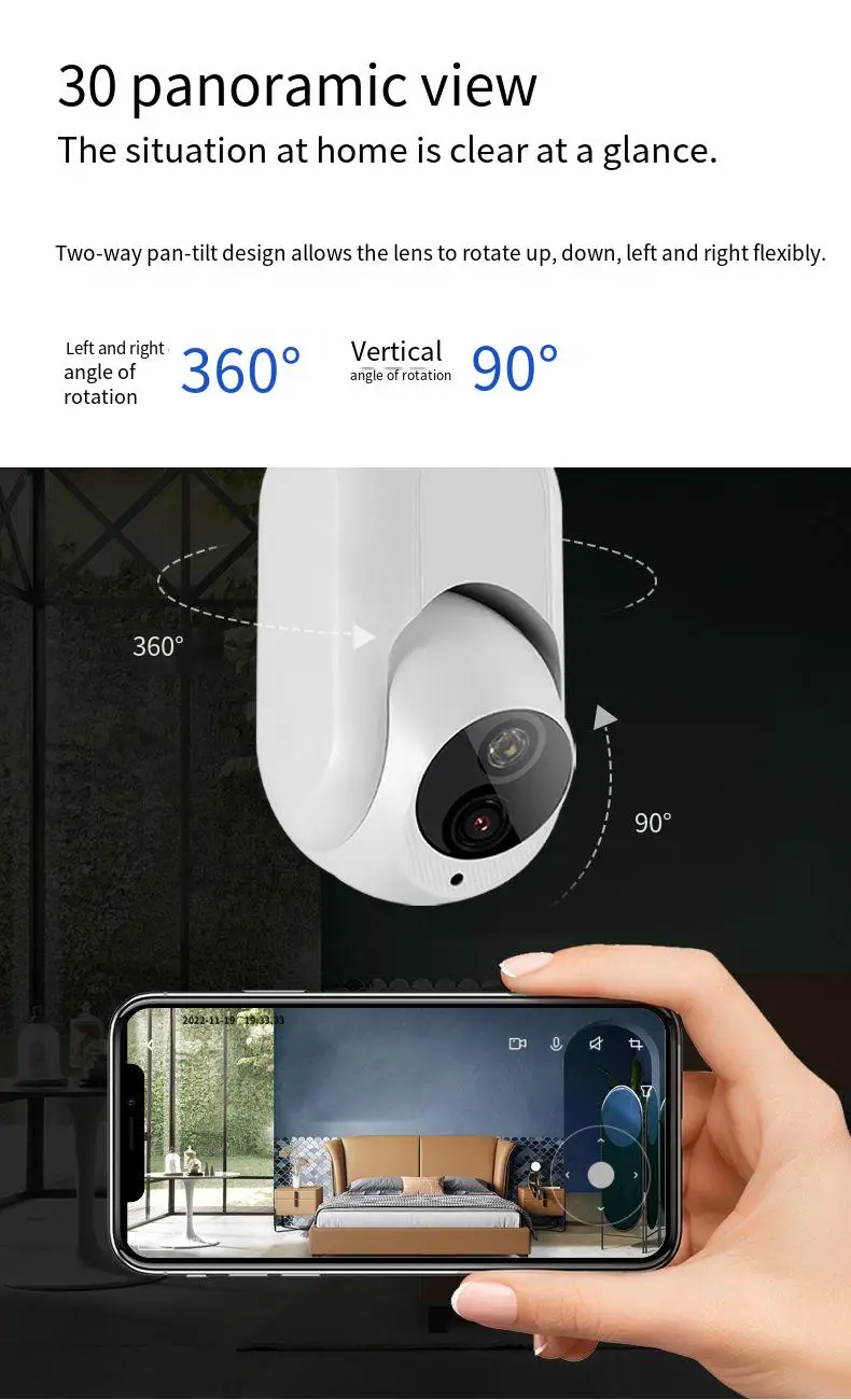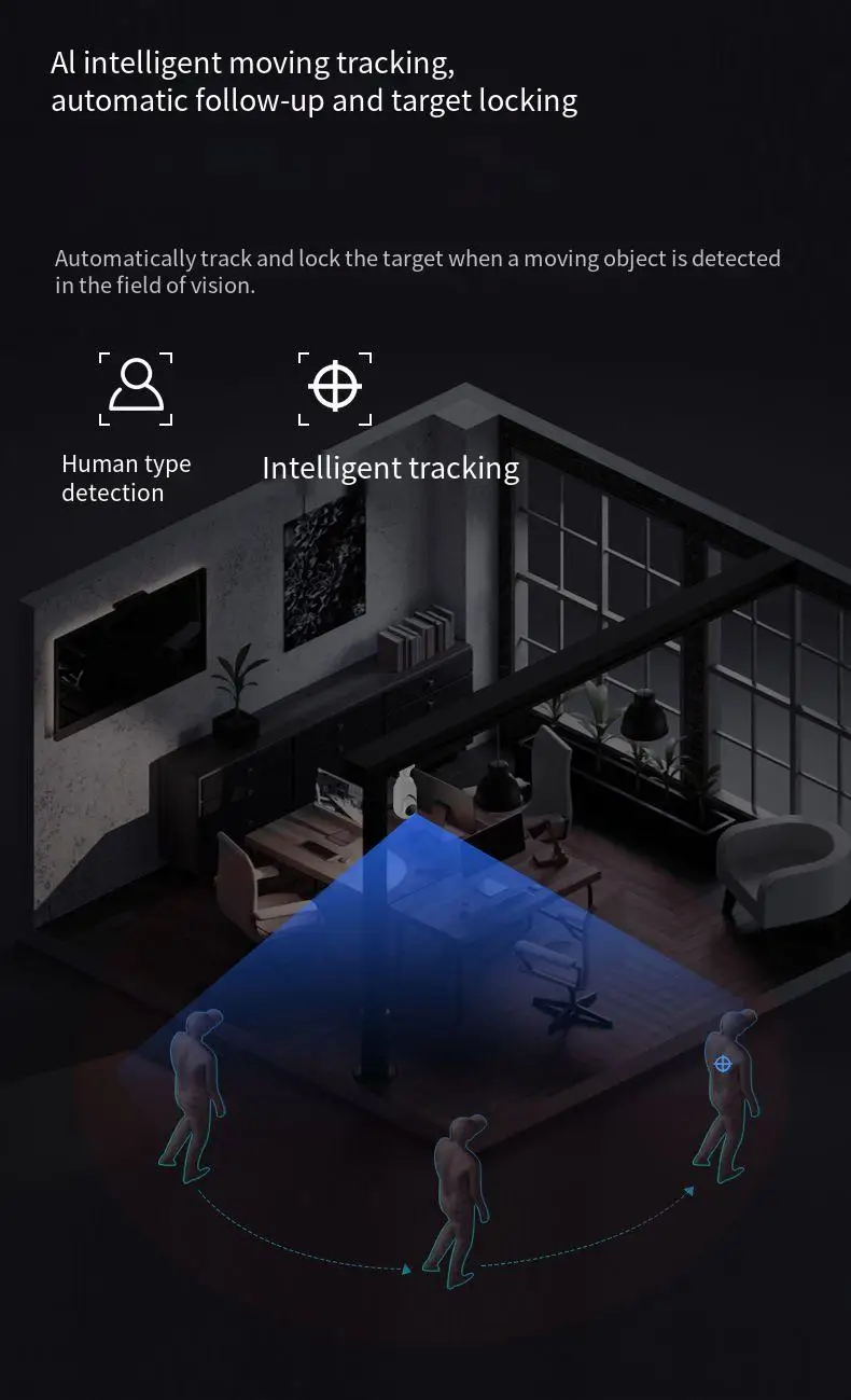 La cámara rastreará automáticamente el cuerpo en posición horizontal cuando alguien se mueva.(puedes abrir o cerrar esta función en la aplicación)