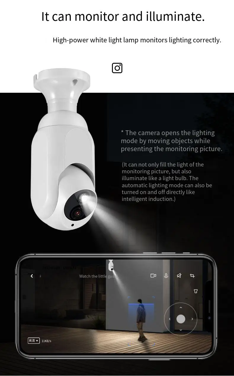 Potentes luces LED blancas y infrarrojas.Puede proporcionar imágenes/vídeos de visión nocturna de muy alta calidad.El alcance de visión nocturna de la cámara es de hasta 20-30 metros en la noche oscura.y el modo nocturno inteligente cambiará automáticamente por la noche si detecta el movimiento.