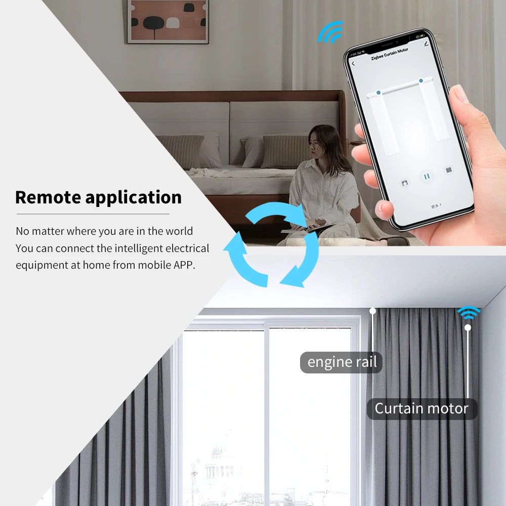 Esta cortina inteligente TUYA motorsupport control de voz la apertura y cierre de cortinas a través de Amazon Alexa y Google Assistant.