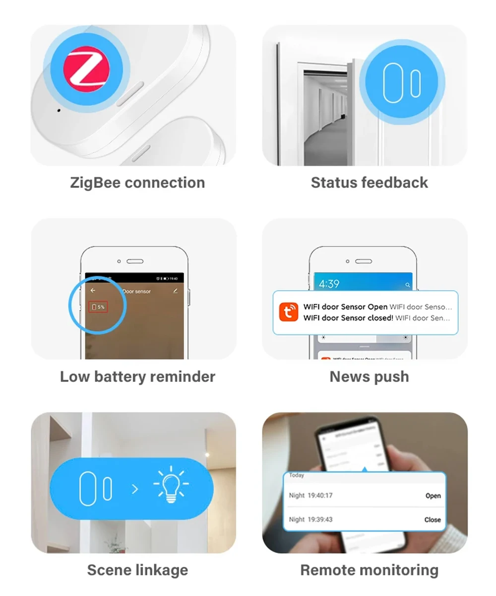 Reciba notificaciones y verifique dos veces en el acto:Reciba notificaciones inmediatas de la aplicación en su teléfono inteligente para puertas y ventanas abiertas/cerradas con sensores de ventana de puerta Zigbee.utiliza comandos de voz para ver el estado actual de las puertas y ventanas abierta/cerrada de un vistazo y controla las rutinas/escenas para su tranquilidad.