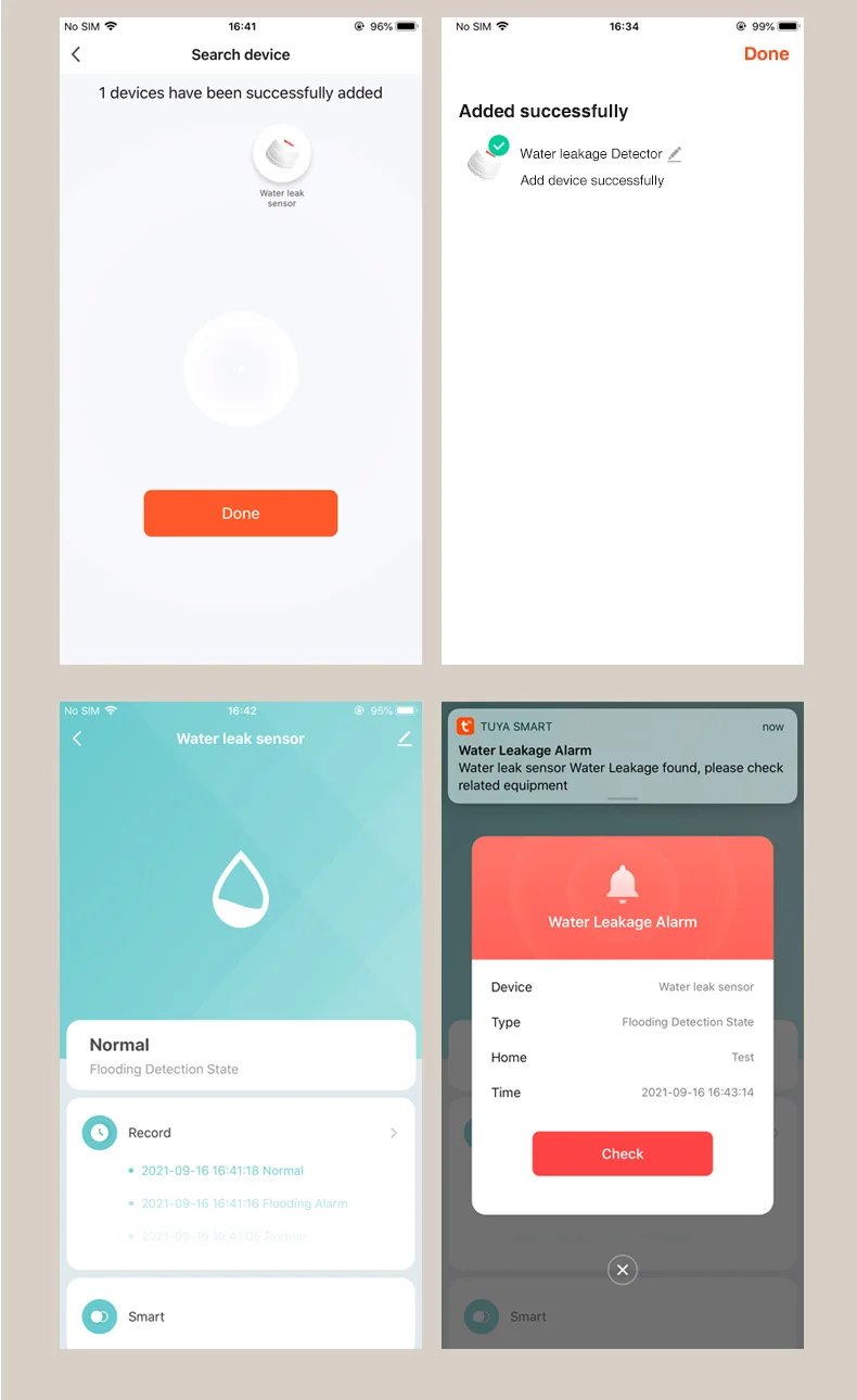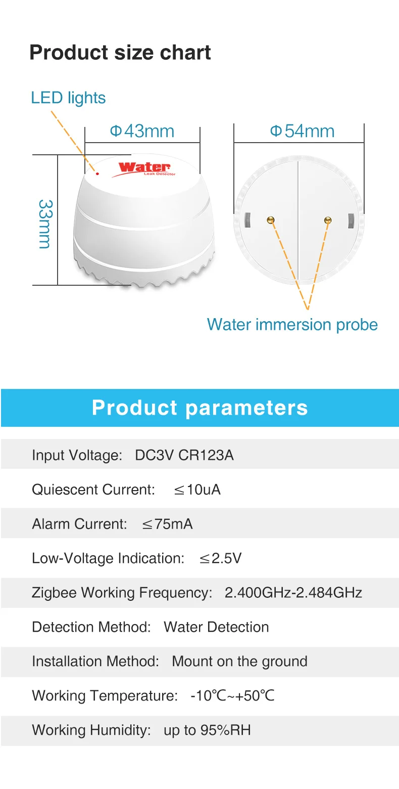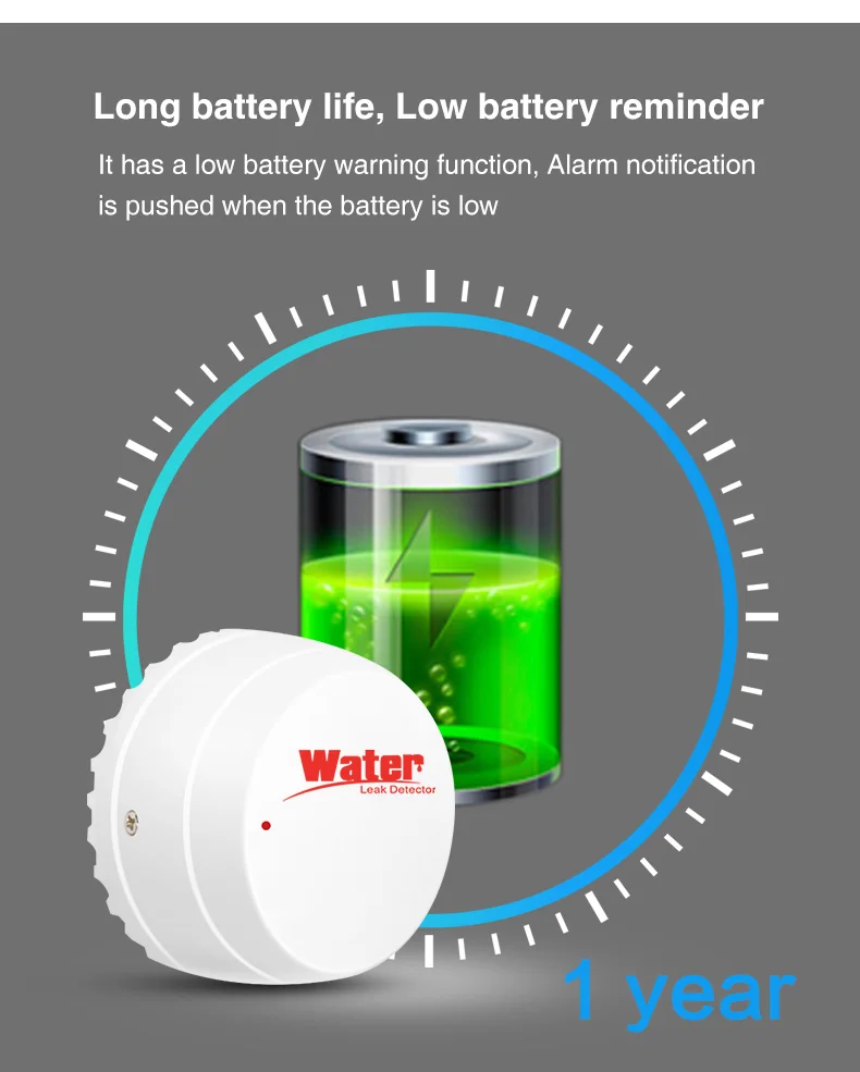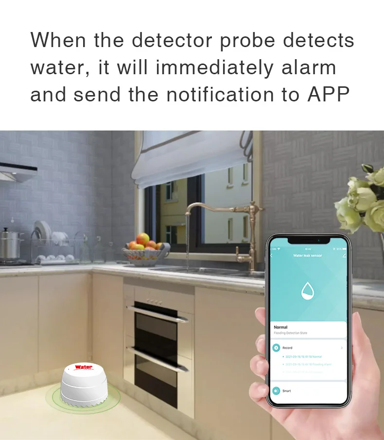 【APP notificación】El sensor puede detectar si hay fugas de agua en la ubicación de instalación. Cuando la sonda detectora de agua, inmediatamente alarma y enviar la notificación a su aplicación.