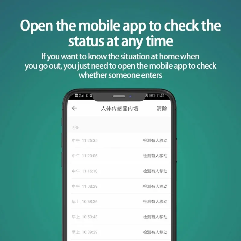 Características: 【Sensor de movimiento avanzado】 PIR detecta el cuerpo humano o los animales que se están moviendo, 120° El ángulo de detección, la distancia de detección de 5 m, puede lograr un monitoreo en tiempo real de día o de noche. Detección sensible del movimiento humano/mascota. 【Función de alerta de emergencia】 Cuando se detecta movimiento, las notificaciones de alerta se enviarán a su teléfono, esté al tanto de lo que sucede en casa incluso cuando esté fuera. 【Seguimiento de registros históricos】Puedes realizar un seguimiento del historial de actividades del sensor. 【Gran rendimiento y tiempo de espera ultralargo】 Larga distancia de transmisión, alta sensibilidad y señal de red fuerte.Tiempo de espera ultralargo, puede durar aproximadamente 18 meses. 【Función de automatización y enlace del hogar inteligente】
