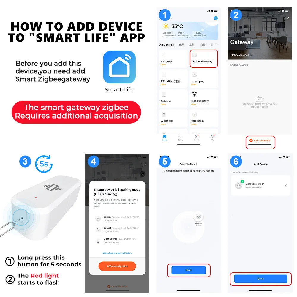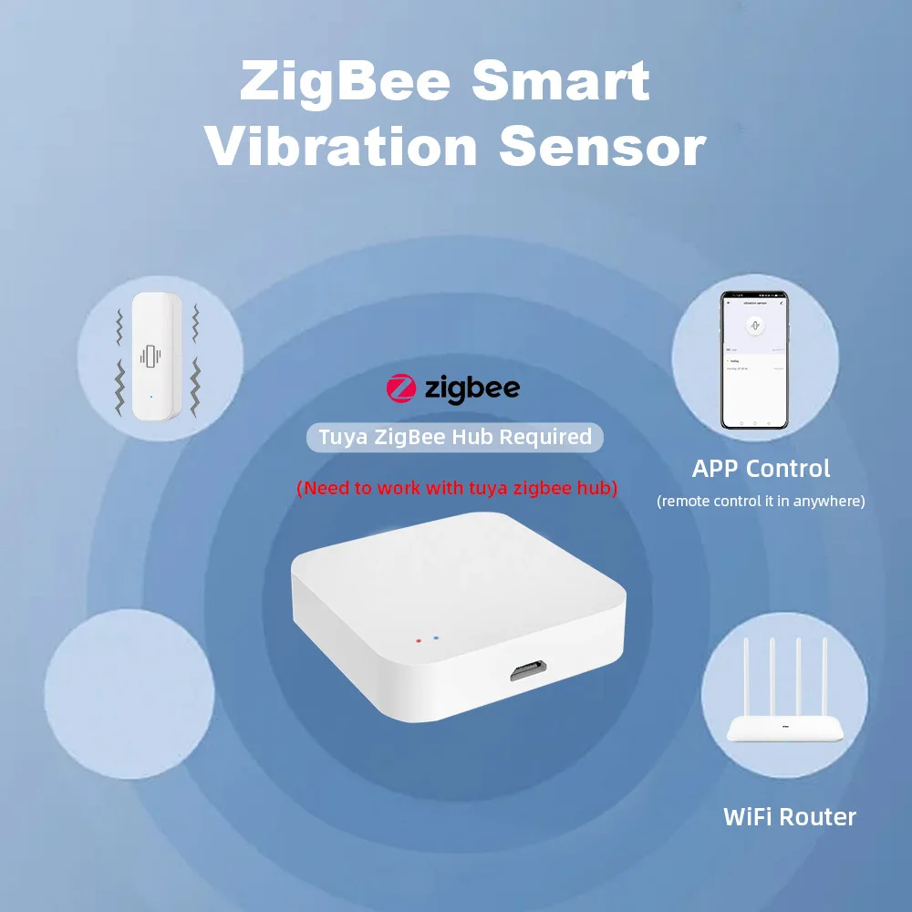 1. Sensor de movimiento de vibración Tuya Smart ZigBee: Un concentrador de puerta de enlace inalámbrico Tuya ZigBee es imprescindible para trabajar con el sensor de vibración, así como una variedad de productos inteligentes ZigBee, que ha demostrado ser el puente y el control Centro para hogares inteligentes y juega un papel insustituible para todos los productos ZigBee y realiza toda la conexión inteligente de su casa. Simplemente agregue el sensor al concentrador ZigBee después de agregar el concentrador a Smart Life/Tuya Aplicación.