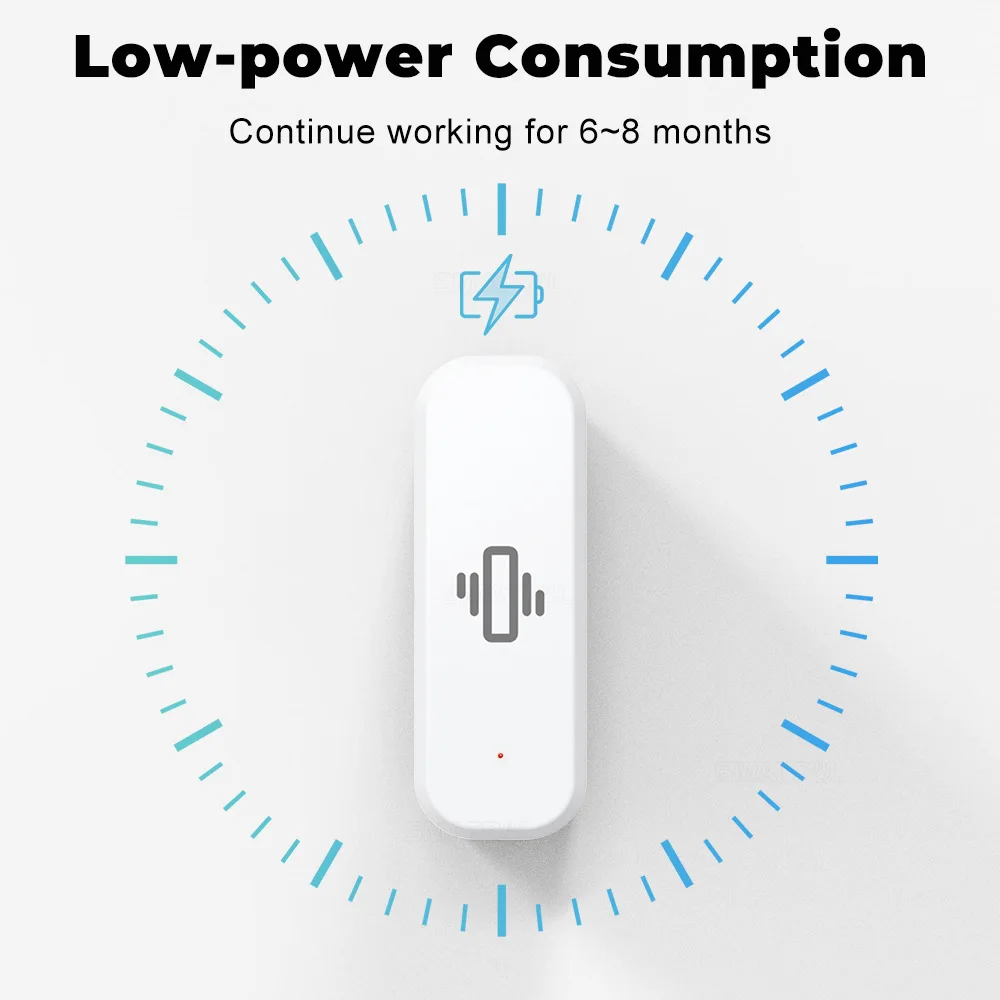 3. Alerta de vibración y alarma de batería baja: habilite la función como alerta de vibración y batería baja en la aplicación Tuya Smart para monitorear la seguridad de su hogar en un dispositivo alimentado por baterías para un modo de espera ultralargo y bajo consumo de energía.