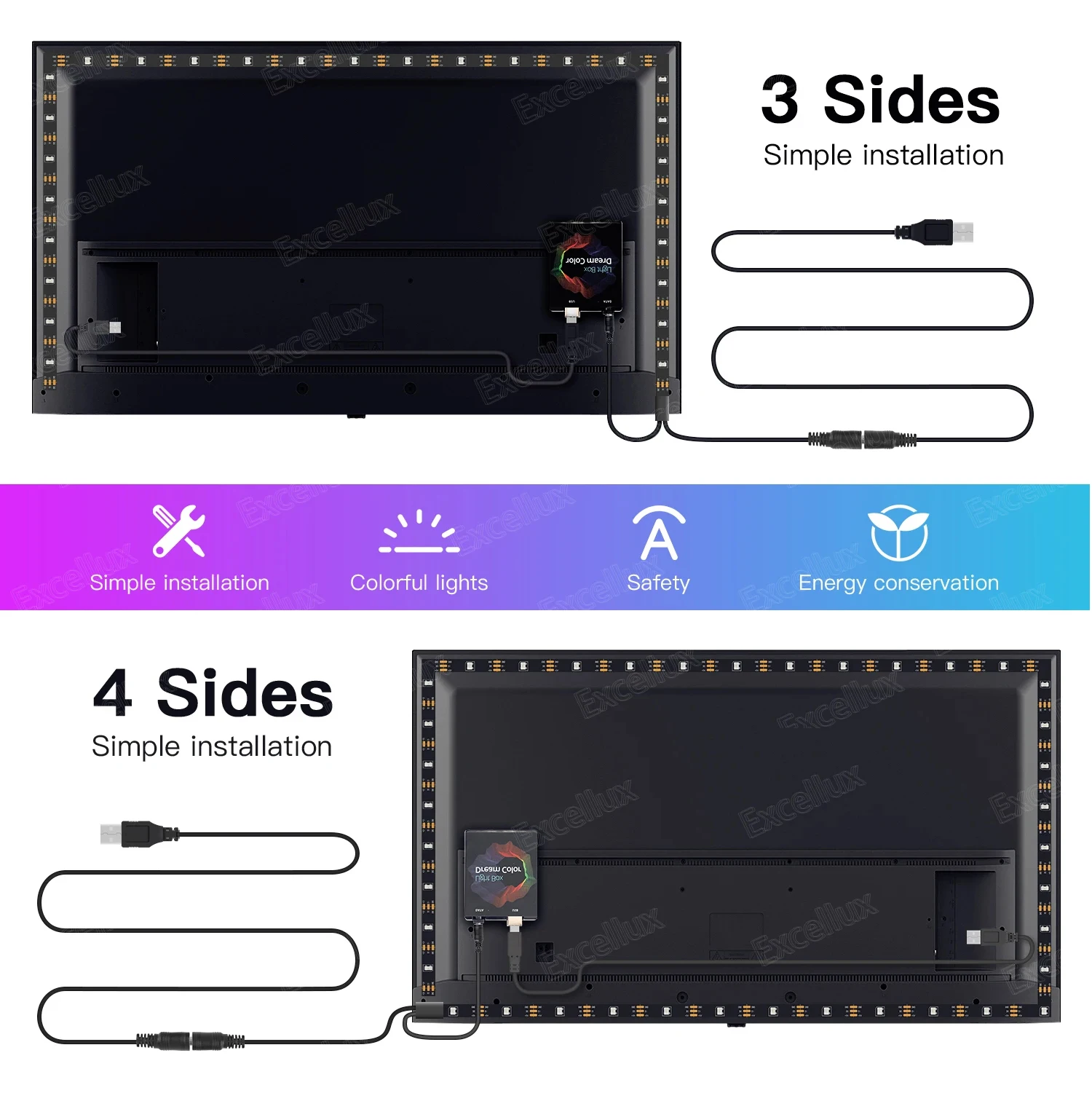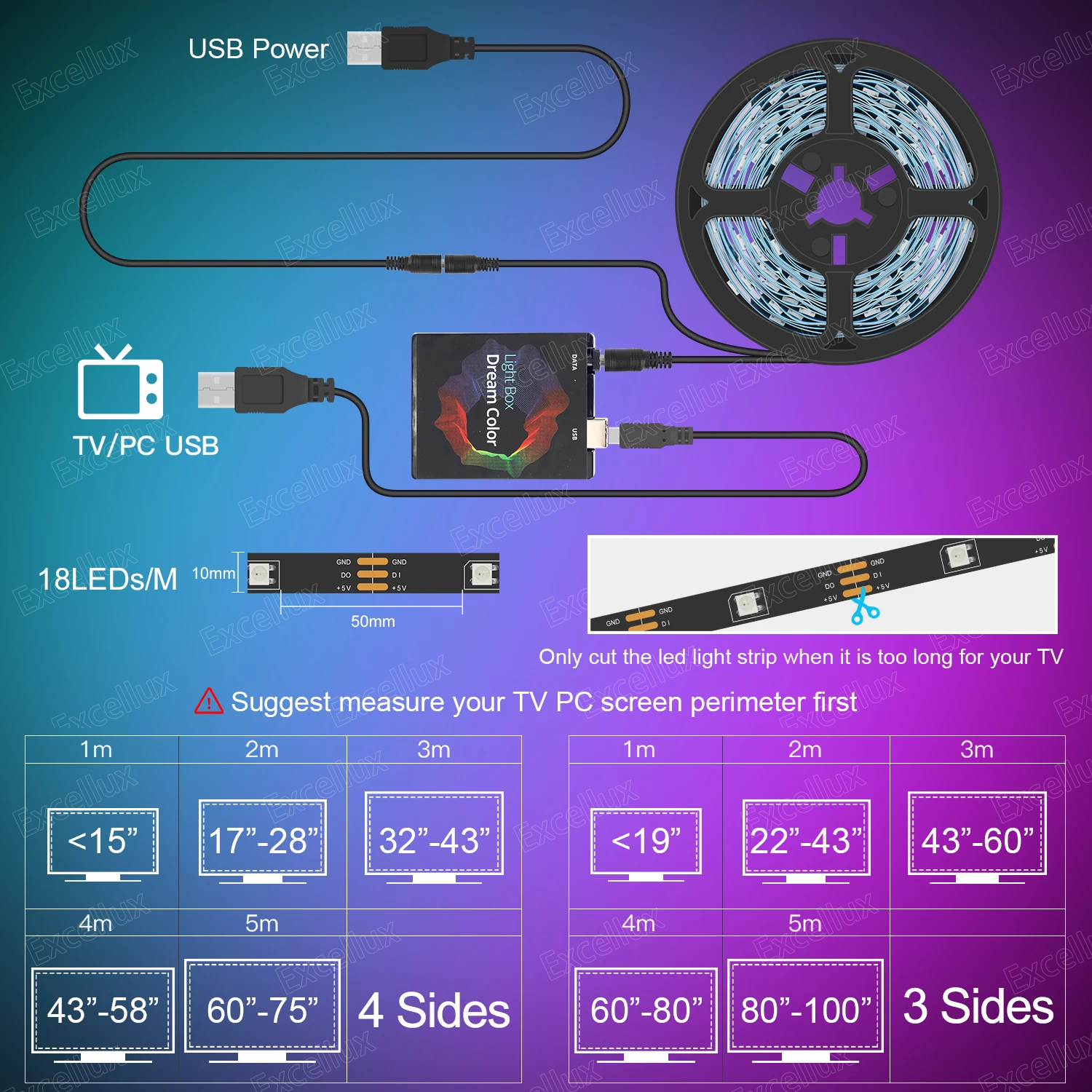 Conecte todo bien y configure primero el área de captura en la APLICACIÓN.Si todo está bien después de la prueba, puede pegar la tira de LED en el televisor y cortar la tira según lo requiera.