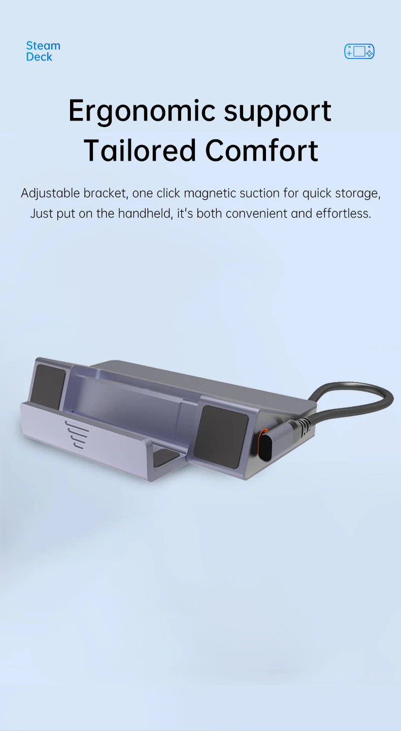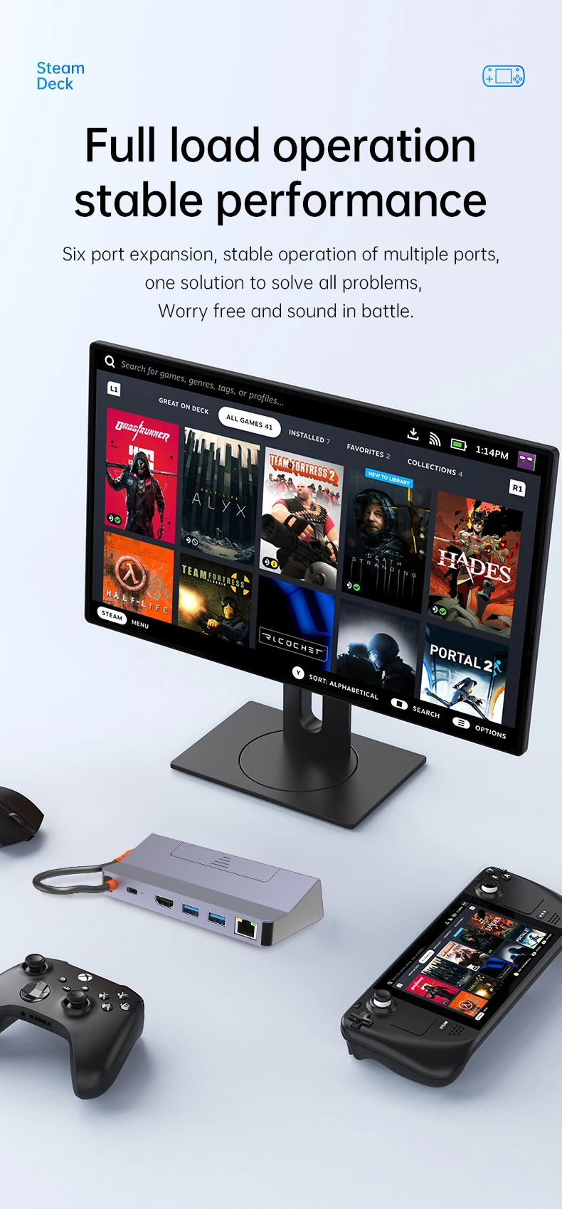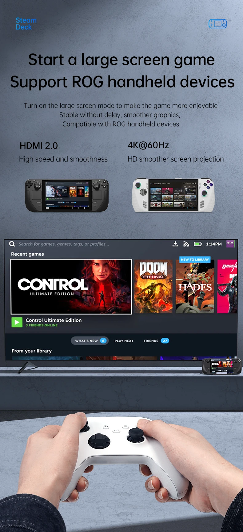 【Salida HDMI 2.0 de 4K a 60 Hz】 La base Steam Deck está equipada con salida HDMI 2.0 de 4K a 60 Hz.Cuando conecta un monitor 4K externo, puede brindarle una experiencia visual más nítida y fluida.