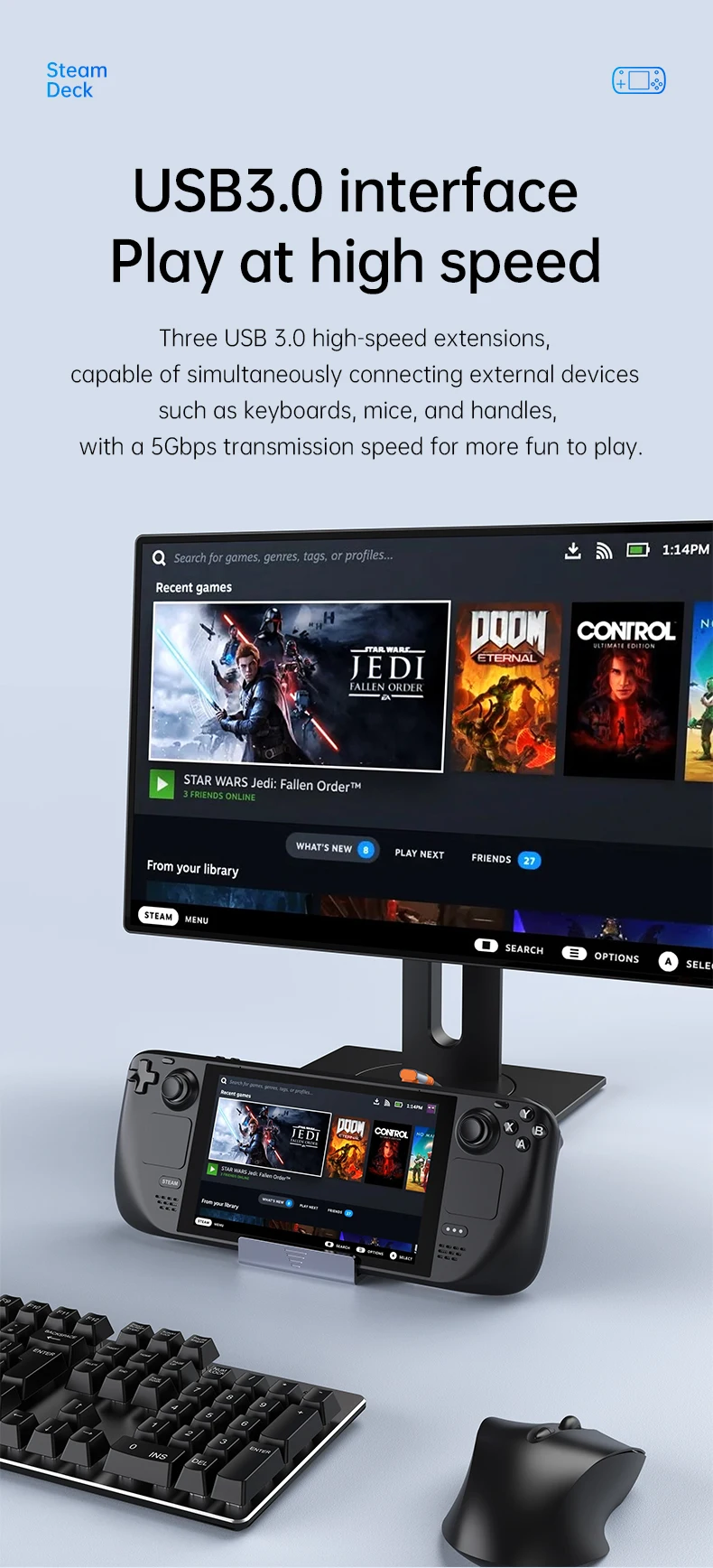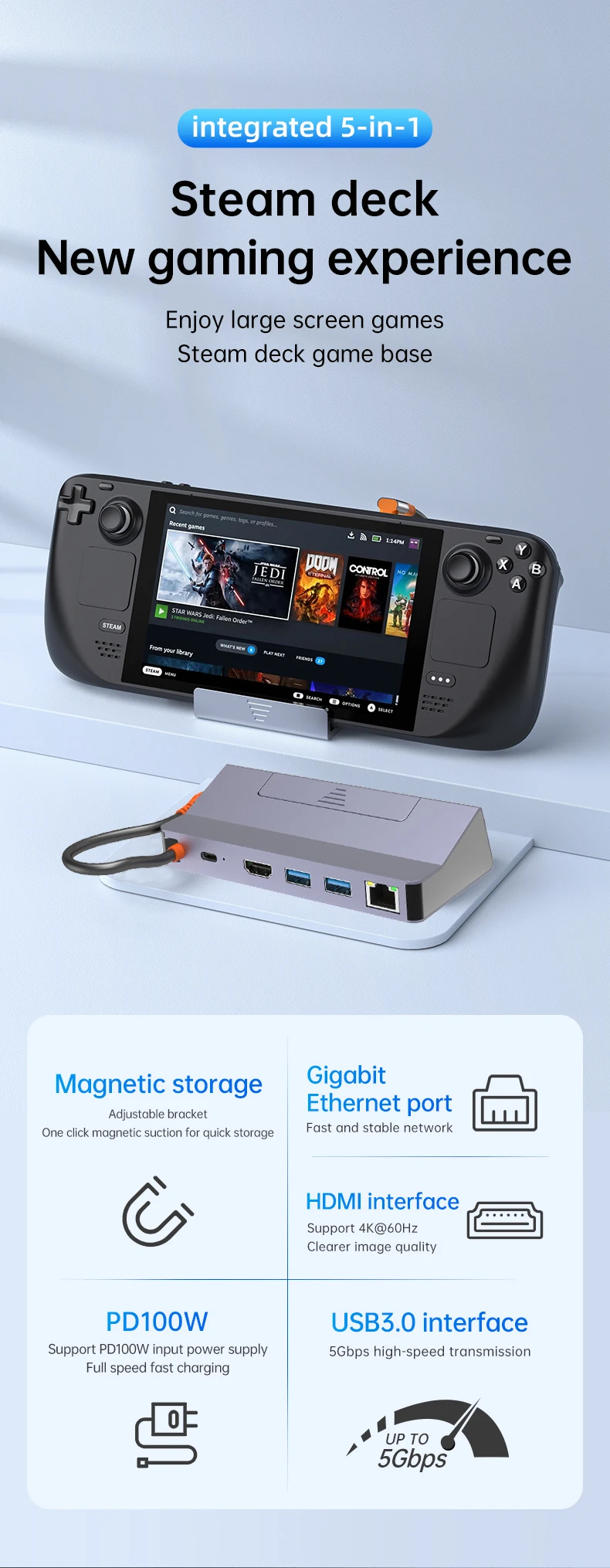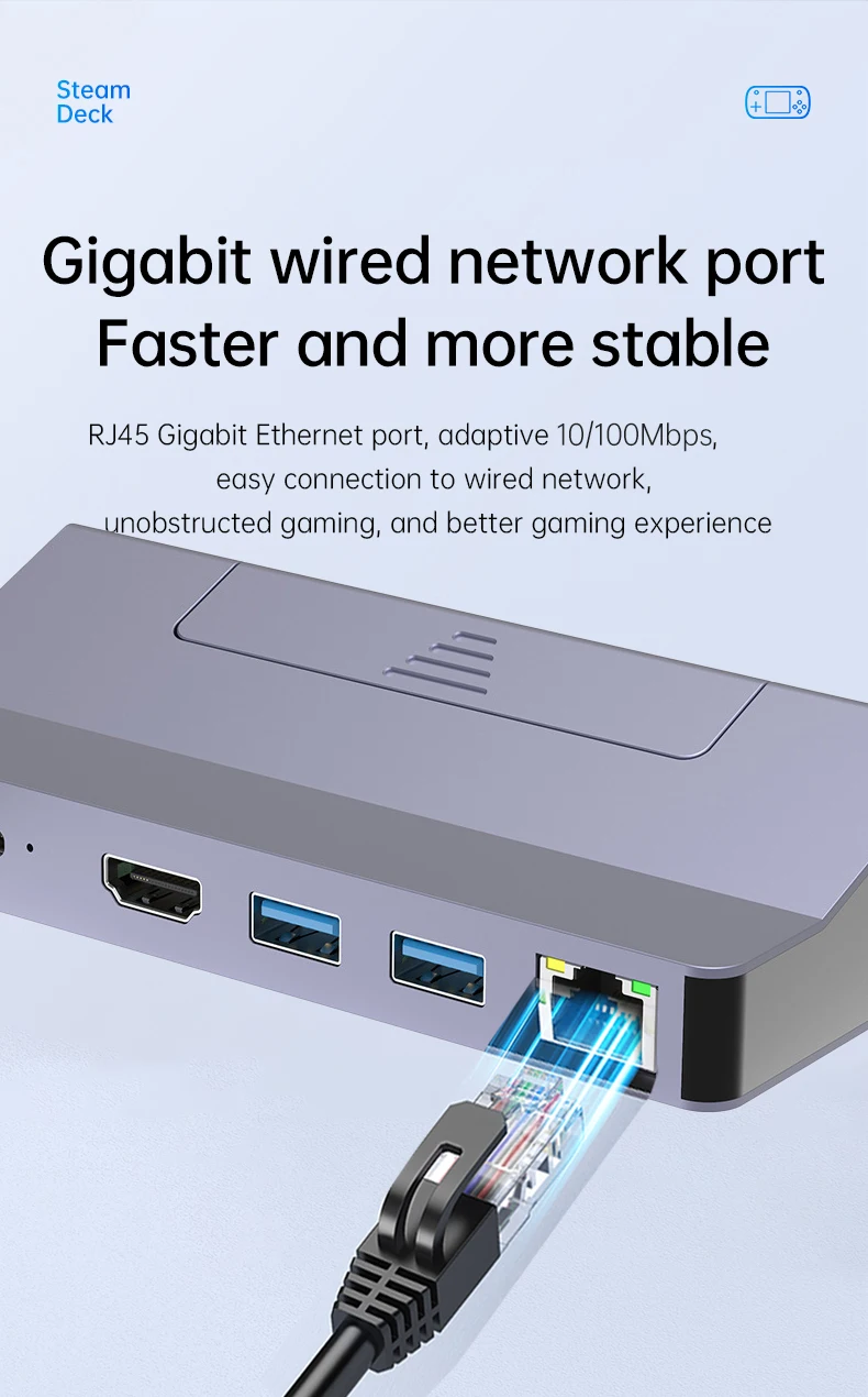 【Puerto Ethernet de alta velocidad de 1000 Mbps】El soporte Steam Deck Dock está equipado con puertos Gigabit Ethernet de hasta 1000 Mbps que le permiten acceder a Internet de manera más instantánea y constante.