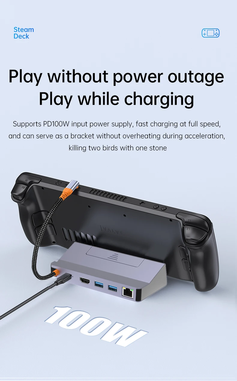 【Velocidad de carga completa para Steam Deck】 La estación de acoplamiento Steam Deck admite una entrega de potencia máxima de 100 W, lo cual es suficiente para cargar su Steam Deck a máxima velocidad cuando se combina con el cargador original.[Nota: La velocidad máxima de carga de la plataforma de vapor es de 45w]