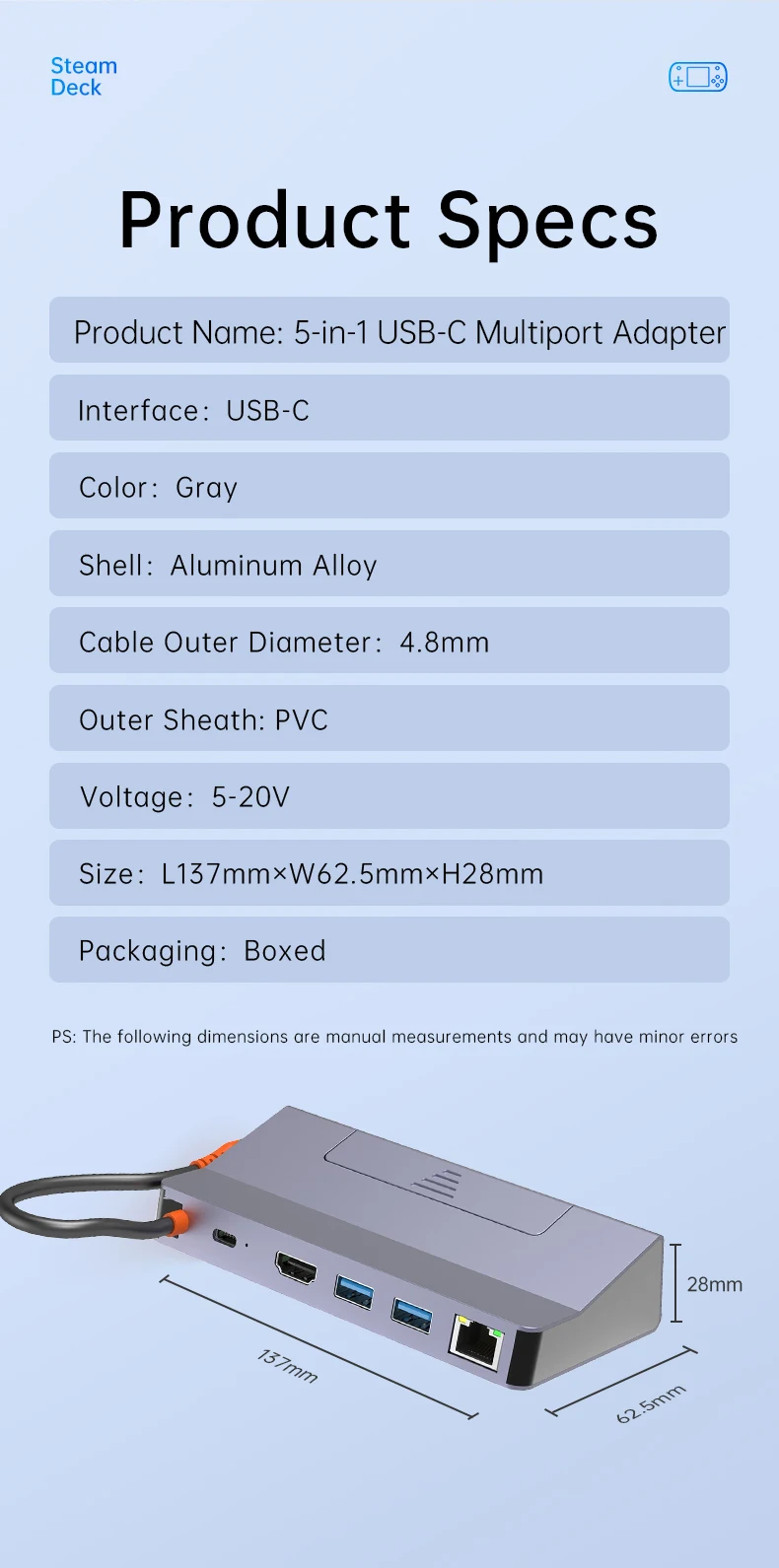 Lo recibí en un plazo razonable de 2 semanas y parece estar bien fabricado. Probado y utilizado con Steam Deck OLED proyectado en un televisor 4K de gran tamaño.