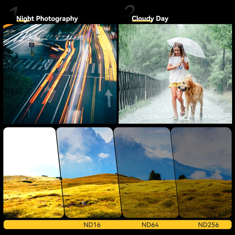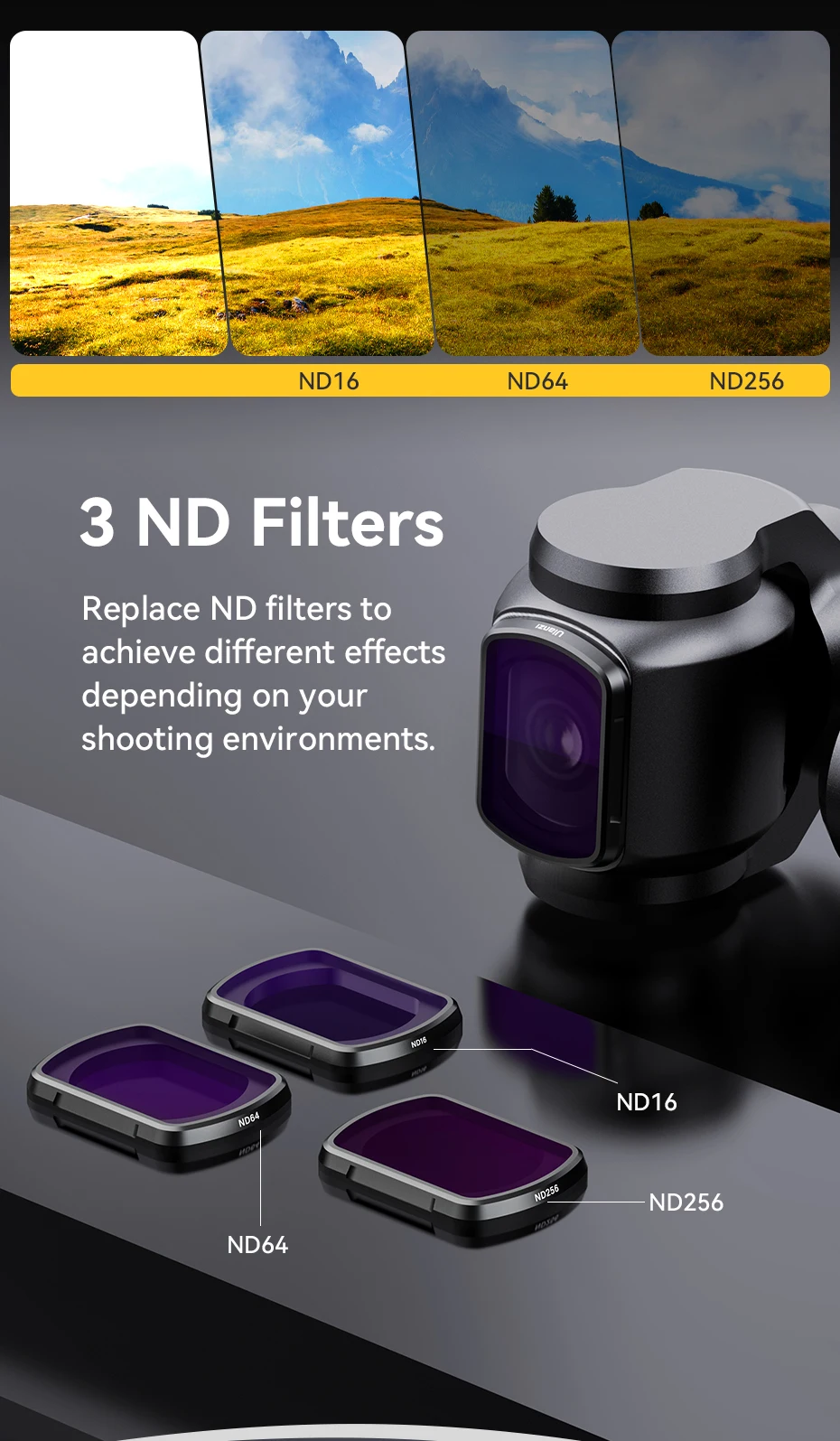 3 filtros del ND de la piezas: La K Incluye filtros ND16, ND64 y ND256.Reemplace los filtros ND para lograr diferentes efectos dependiendo de sus entornos de disparo.