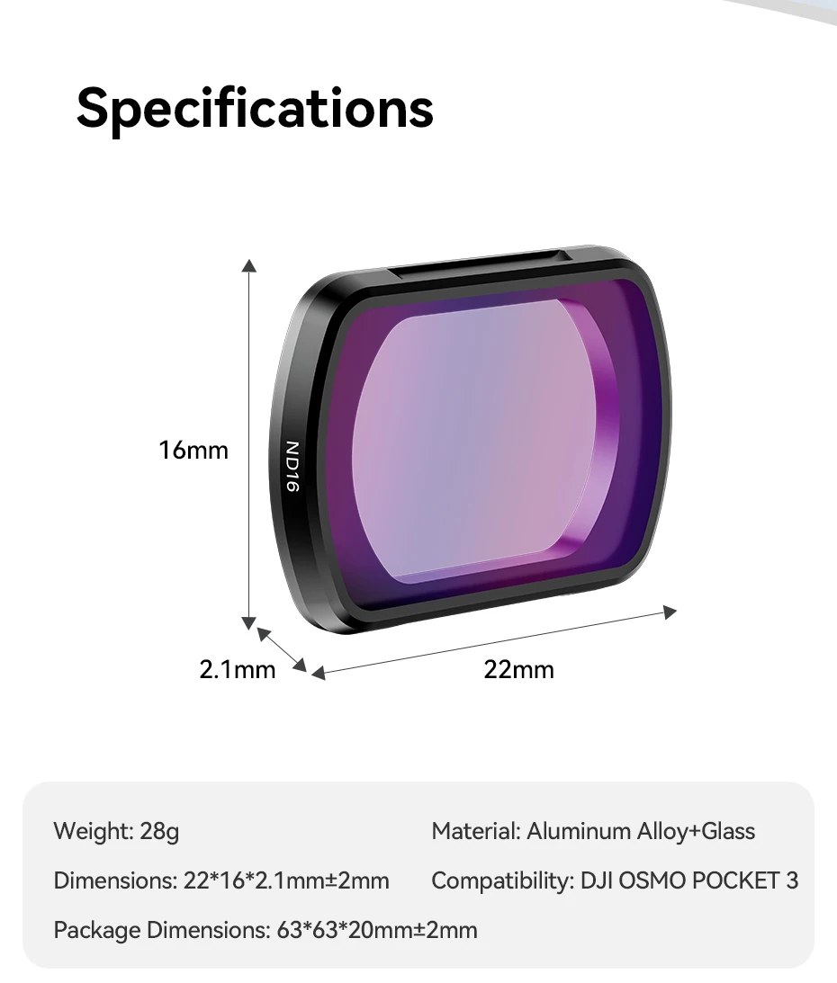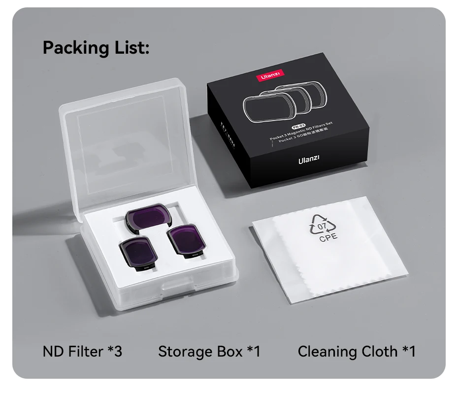 Lista de embalaje: filtro ND * 3, caja de almacenamiento * 1, paño de limpieza * 1