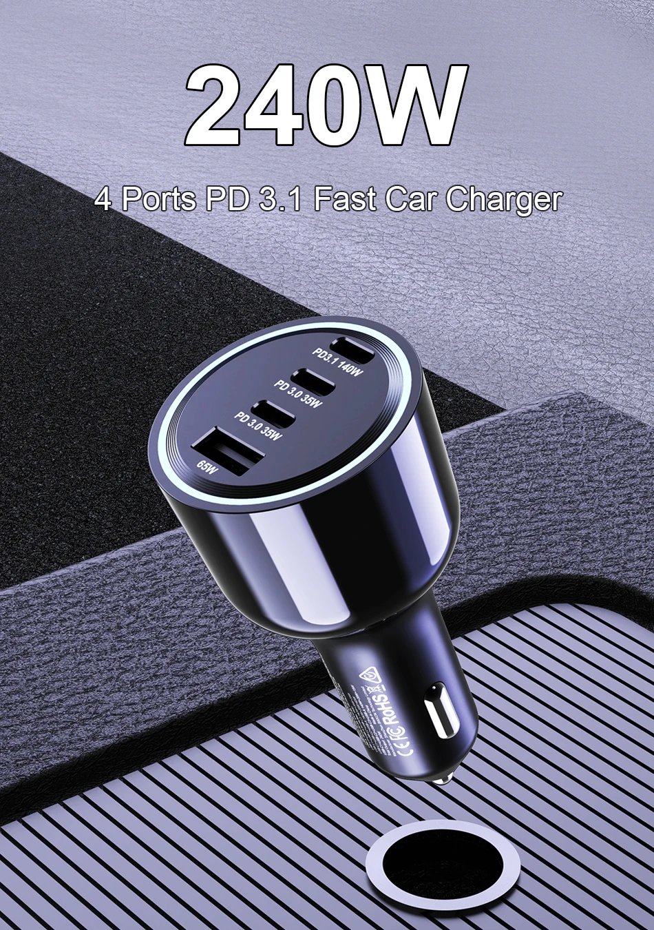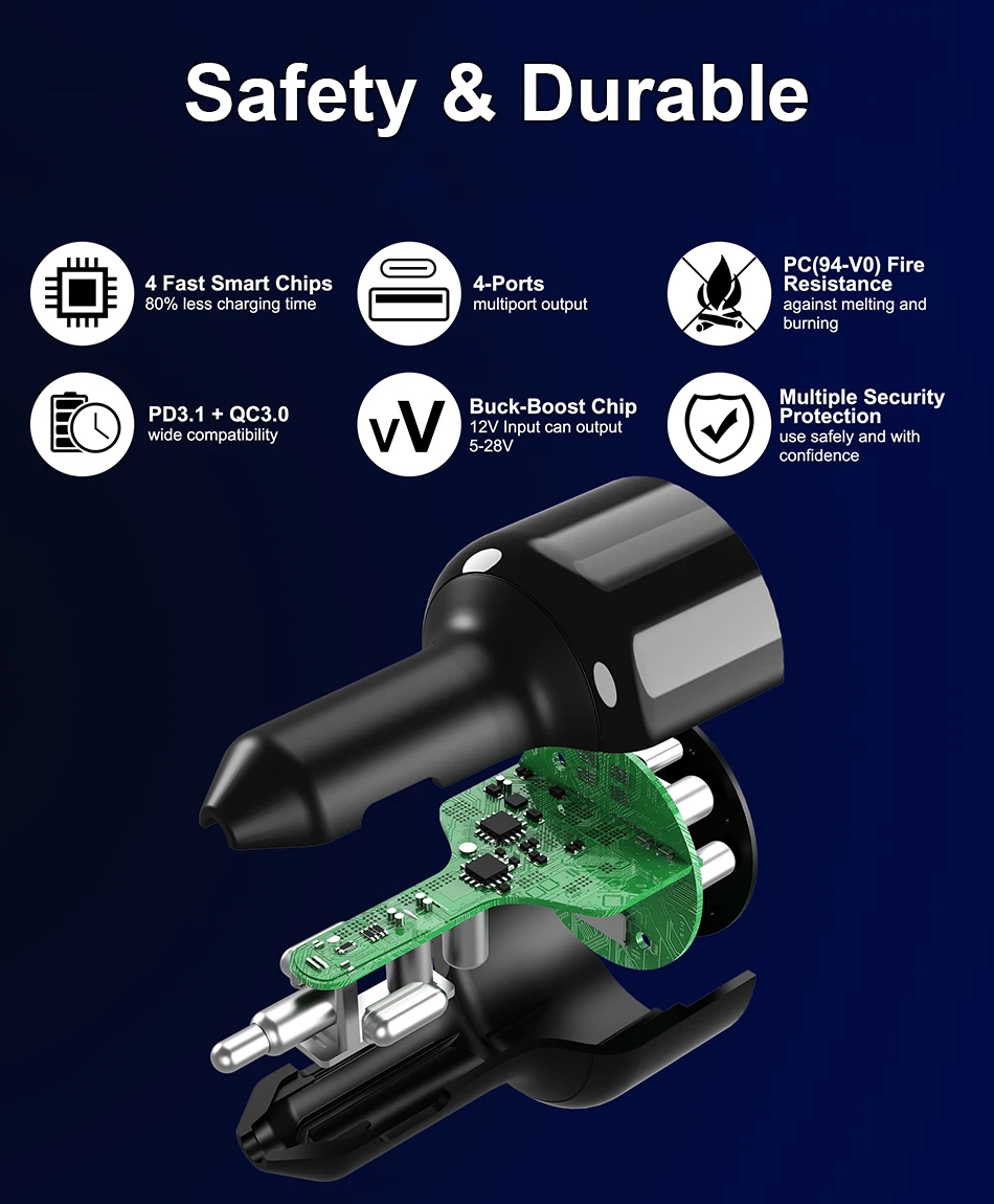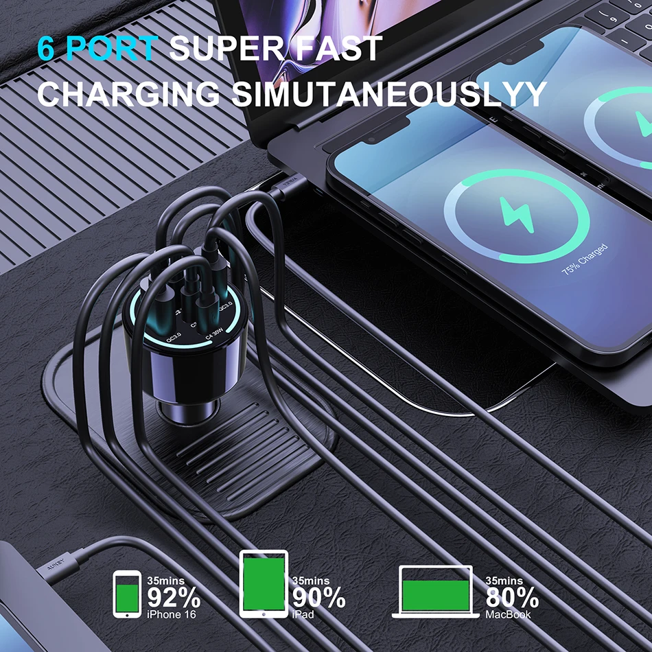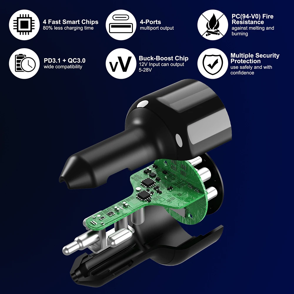 Equipado con un puerto USB A y 3 puertos USB C, el cargador de automóvil Ubigbuy 240W USB C carga 4 dispositivos simultáneamente.