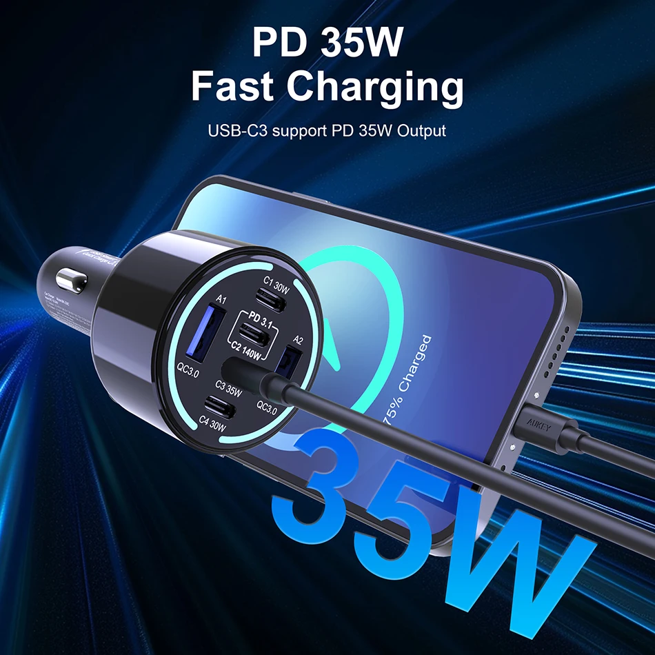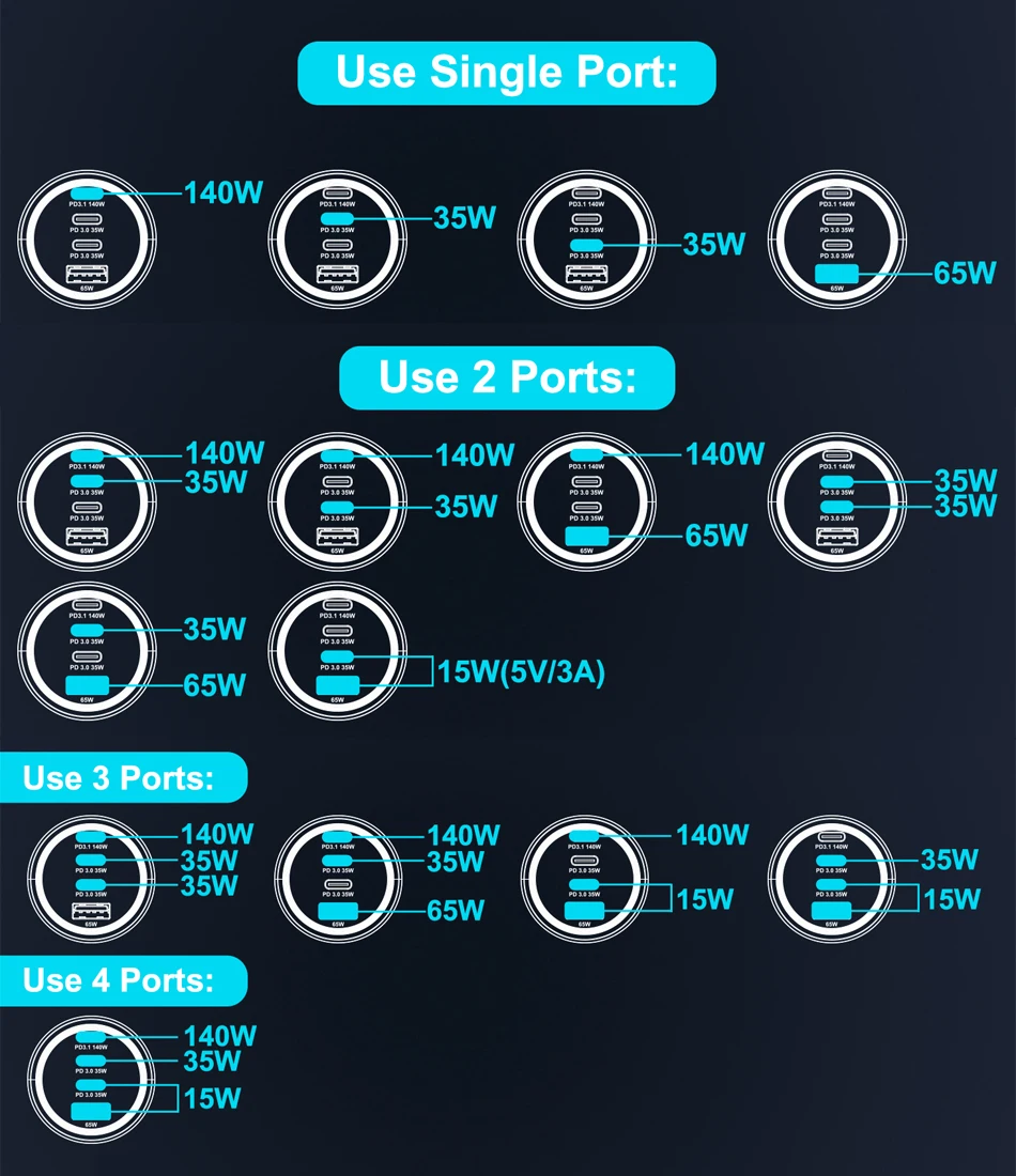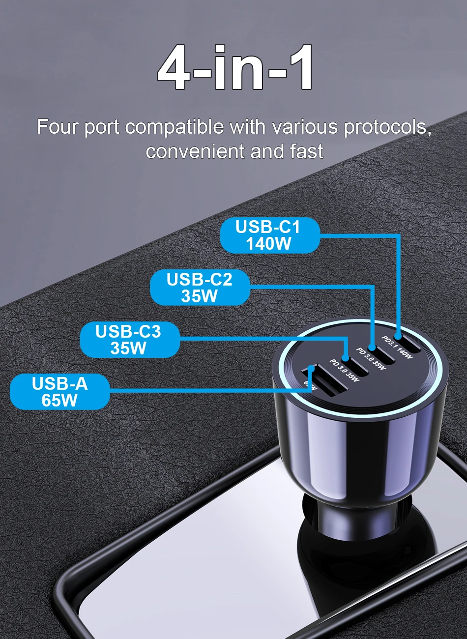 Cuatro puertos compatibles con varios protocolos, cómodos y rápidos.USB-C1 de 140 W compatible con suministro de energía PD3.1/PD3.0, carga rápida QC5, AFC, FCP, PPS 45W/25W protocolos de carga súper rápida 2.0; USB-C2/C3 de 35 W compatible con PD3.0, PPS, AFC, FCP; 65 W USB-A admite carga rápida QC3.0 y carga USB IC inteligente de 2,4 A.