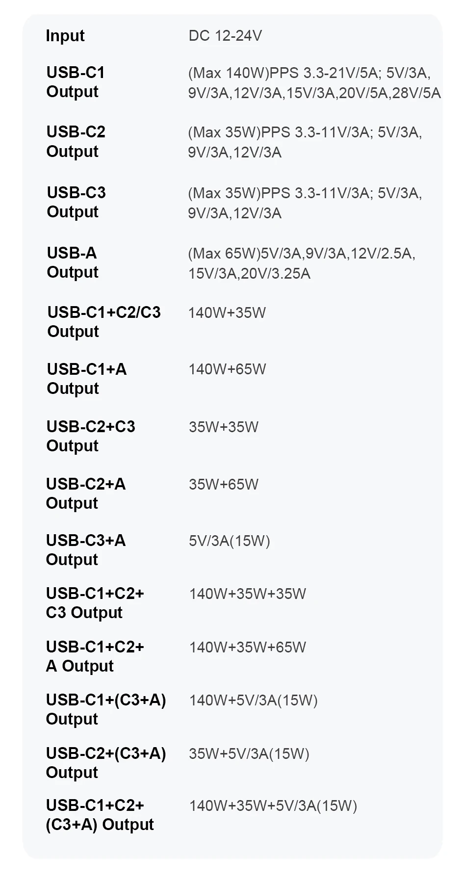 USB-C1+C2+(C3+A) Salida: 140W+35W+5V/3A (15W)