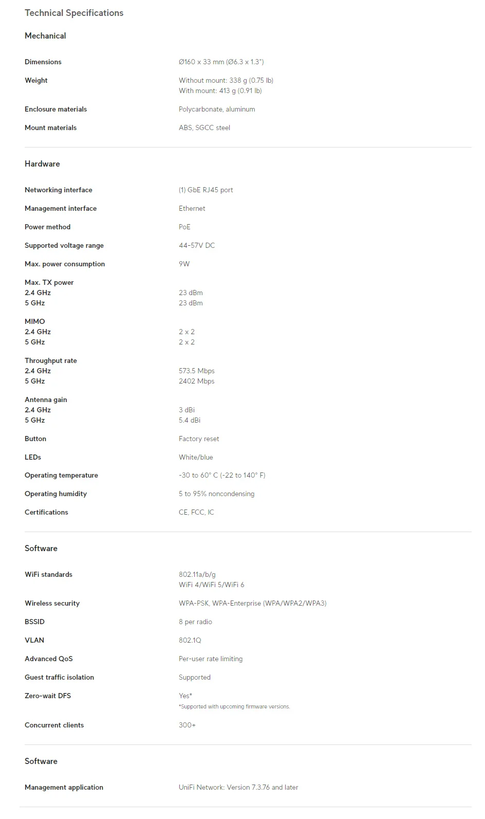 El punto de acceso U6+ es un punto de acceso Wi-Fi 6 de 2x2 que ofrece un rendimiento de radio general de hasta 2,4 Gbps con radios de 5 GHz (MU-MIMO y OFDMA) y 2,4 GHz (MIMO).