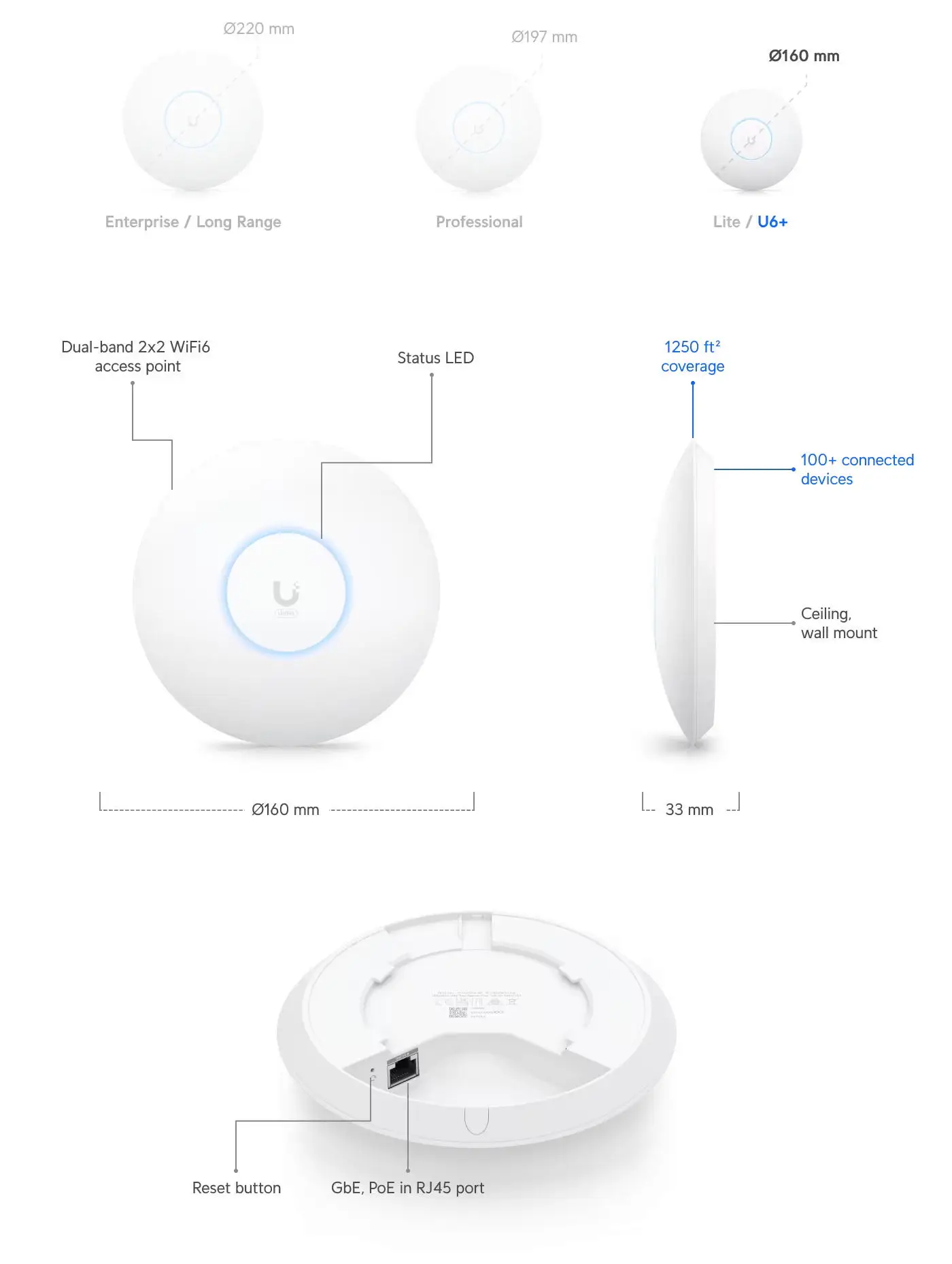 Monte el UniFi 6+ horizontalmente en el techo para una cobertura de hasta 140 m2, o móntelo verticalmente en la pared para ampliar su alcance.UniFi 6+ tiene un diseño compacto y de tamaño nanométrico, por lo que puede utilizar cubiertas nanoHD y accesorios de montaje.