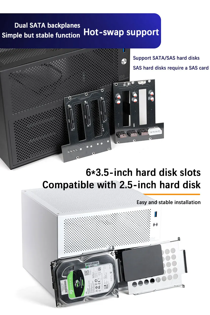 UENORTH UE-S6 chasis NAS de seis ranuras placa base itx servidor de almacenamiento de escritorio DIY caja pequeña con plano posterior compatible con intercambio en caliente