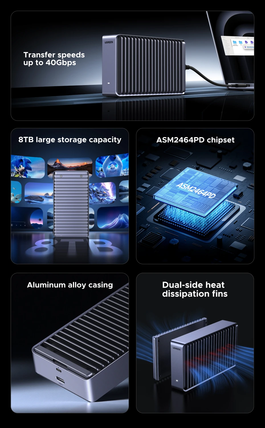 ¡Me gusta este producto! El único inconveniente que tengo con esto es su compatibilidad con laptops Mac (M3). Mi Mac es muy exigente con los dispositivos USB, y este se percibe como una carcasa USB en lugar de aprovecharlo como un dispositivo PCIE Thunderbolt. En mi caso, estoy utilizando Parallels Windows y aprovechando mis datos porque en Finder siempre aparece el error de solo lectura, sin importar cómo formatee mi SSD (Kingston KC3000 de 4TB). Por lo tanto, solo puedo alcanzar un total de 1 GB/s en lugar de los 2000-2800+ MB/s habituales, y necesitaré comprar otra carcasa para conectarla directamente a mi Mac. Para ventanas y casos en los que no te encuentres con problemas de compatibilidad con Mac, ¡este producto es excepcional! Nada menos de lo que esperaba de UGreen. Su diseño, las pequeñas almohadillas que lo mantienen en posición vertical, la carcasa que lo mantiene fresco: ¡muy bien! La instalación fue sencilla y viene con un tornillo para ayudarte, además de su propio cable Thunderbolt: ¡úsalo si aún no lo has hecho!