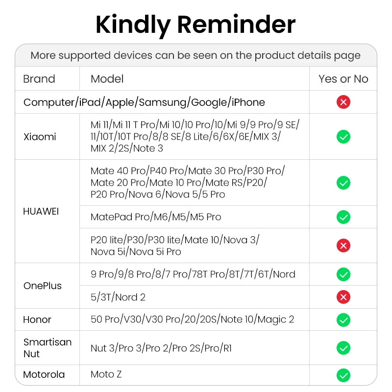 (1) Serie XIAOMI: Mi 11/10/10 Pro 、 Mi 9 Pro 、 9/9 SE 、 8/8 SE/8 Lite 、 6/6X 、 MIX 3 、 MIX 2/2S 、 Note 3 、 redmi 7/K40,(2) Serie HUAWEI: Mate 40 Pro, P40 Pro, 30 Pro, Mate 20 Pro, Mate 10 Pro, P30 Pro, P20/P20 Pro, Nova 6, Nova 5/5 Pro mate RS, Mate Pad Pro, 8,4 pulgadas, 2, 1, 2, 2, 1, 2, 2, 2, 2, 2, 2, 2, 2(3) Serie Honor: V30/V30 Pro, 20/20 Pro/20S, Note 10, Magic2(4) Serie OPPO: Find X, Find X2 Pro, Find X3/ X3 Pro(5) Serie OnePlus: 9/9 Pro 、 8/8T/8 Pro 、 7/7T/7Pro 、 6T 、 Nord(6) Serie Smartisan: R1 、 Nut Pro/Pro 2/Pro 3(7) Otras Series: Black Shark 2/Helo, Mota Z, Nubia Z17/Z17S, HTC U11, Motorola Mota Z/Z2 Force.Dispositivos incompatibles:Ordenador 、Serie Samsung、 Serie Google, serie iPad* PuntasPara equipos que no están en la lista, consulte al Servicio de Atención al Cliente para comprobar la compatibilidad.