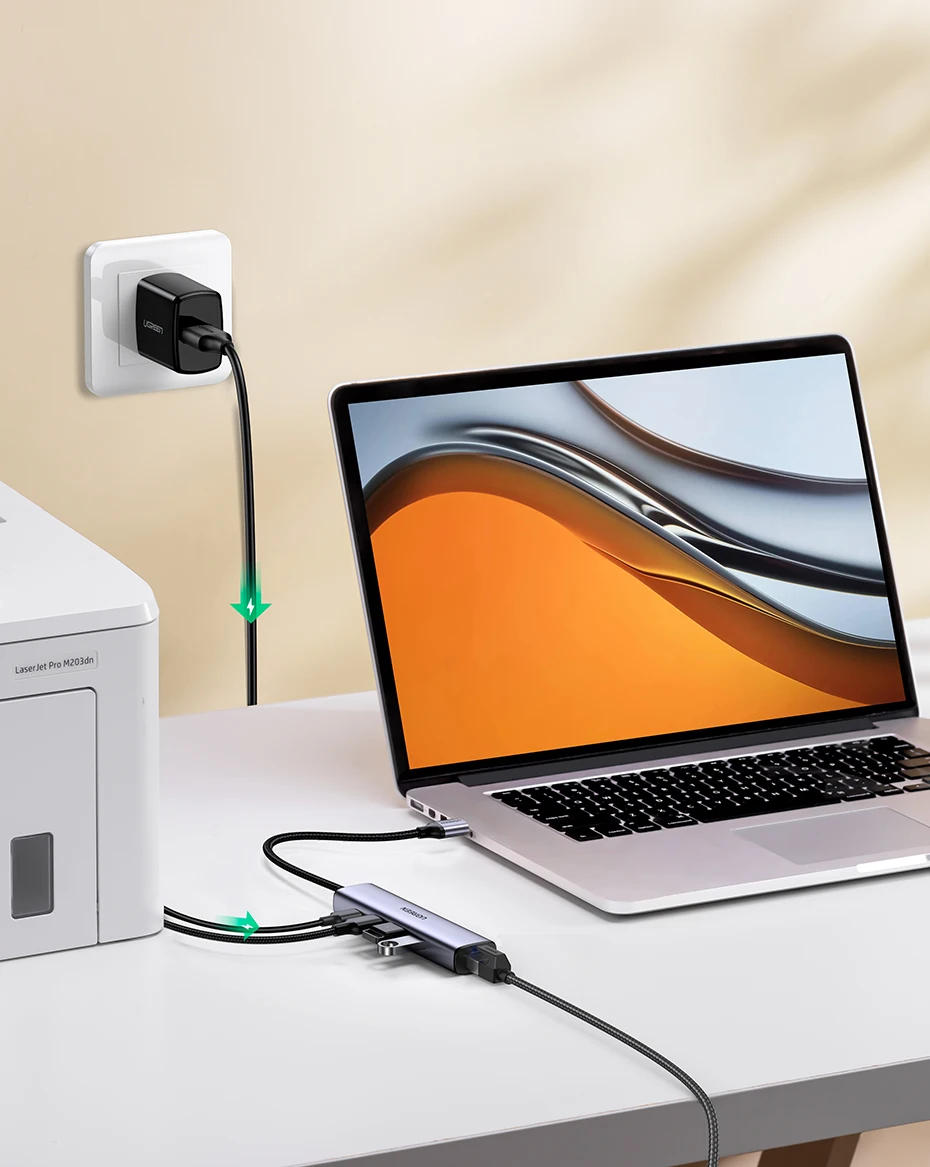 When you use high-power devices like HDD,printer,or multiple devices, you can use this port to supply power and get stable performance. (This port doesn't support charging laptops)