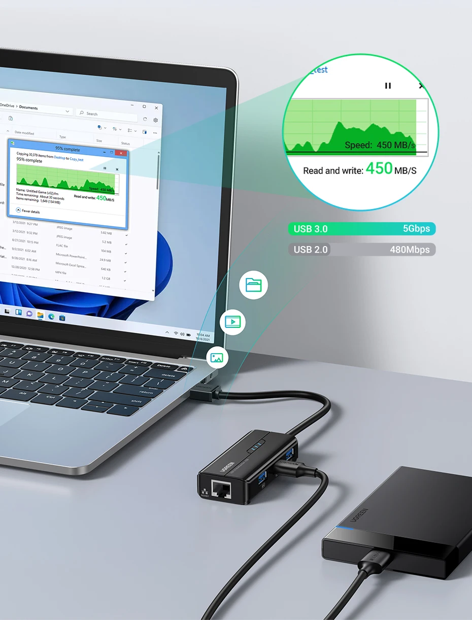 UGREEN USB 3.0 1000Mbps Ethernet Adapter is designed with 3 high-speed USB 3.0 ports, the data sync of USB 3.0 can up to 5Gbps, which is 10x faster than USB 2.0.