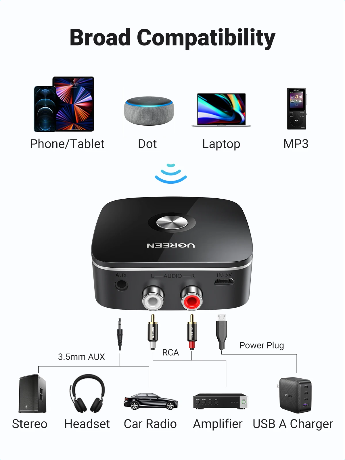 Comprar UGREEN-Adaptador de receptor Bluetooth AUX RCA para sistema estéreo doméstico, HiFi, 3,5mm, para RECEPTOR ESTÉREO antiguo