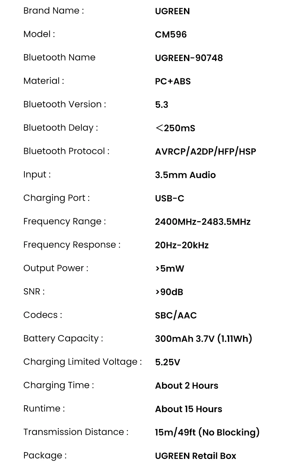 Batería integrada de 300mAh, 15 horas de duración de la batería, y solo se necesitan 2 horas para cargar completamente el dispositivo mediante un cable de carga rápida tipo C.