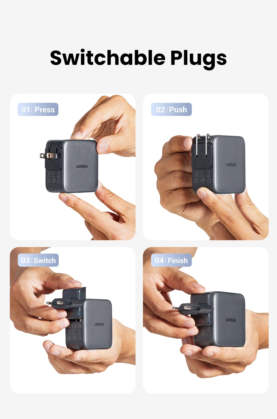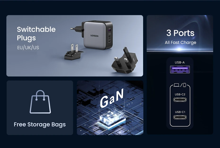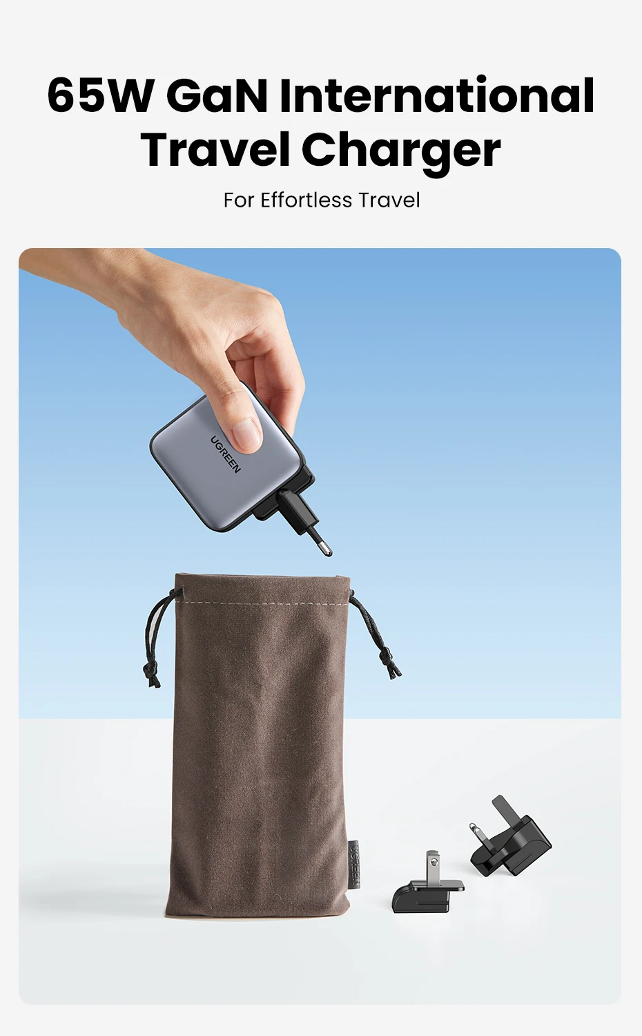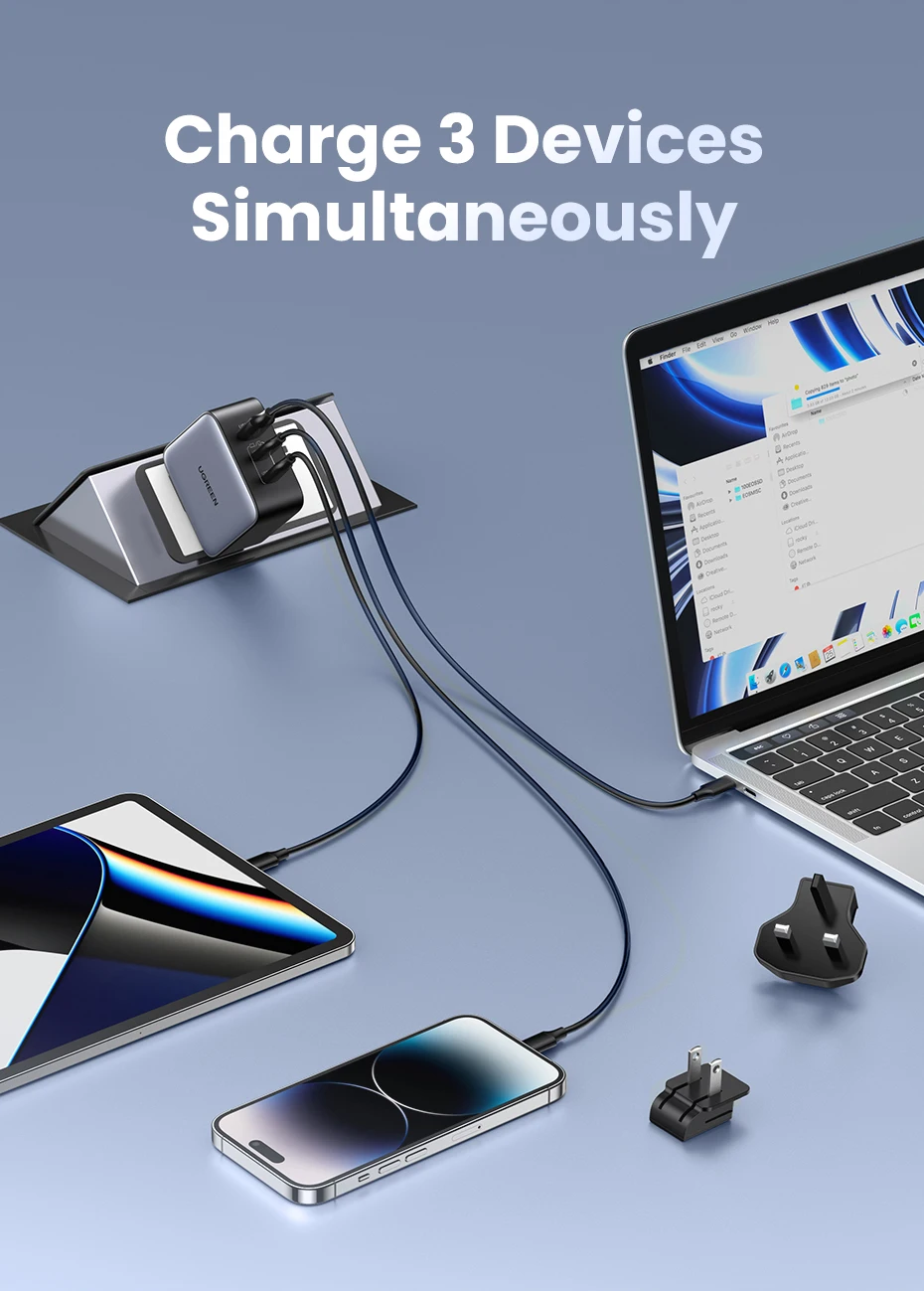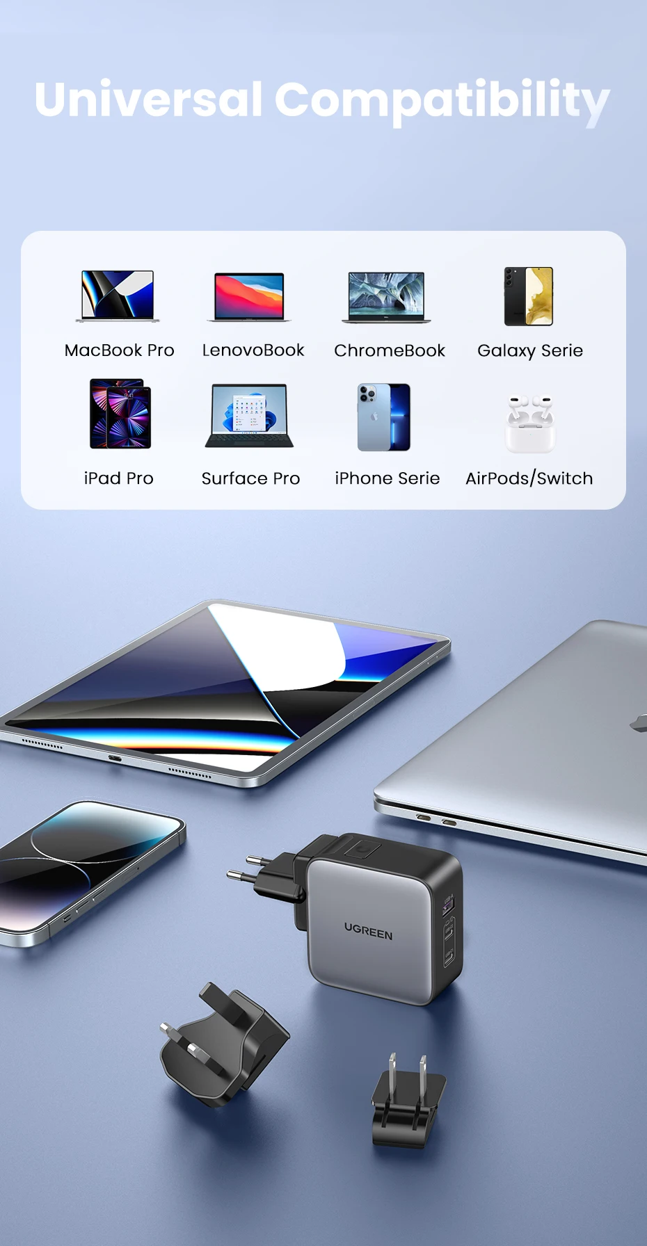Lo compré porque viajo harto y, además, compré una batería Ugreen. Excelente combinación, puedo utilizar múltiples entradas para cargar 3 dispositivos (considerar que si se hace todo simlutáneo la potencia y velocidad de carga disminuye). Lo que me hizo elegir este en particular fue la fácil forma de cambiar el adaptador de corriente, a fin de viajar cómodo sin tener que preocuparme por más aparatos.