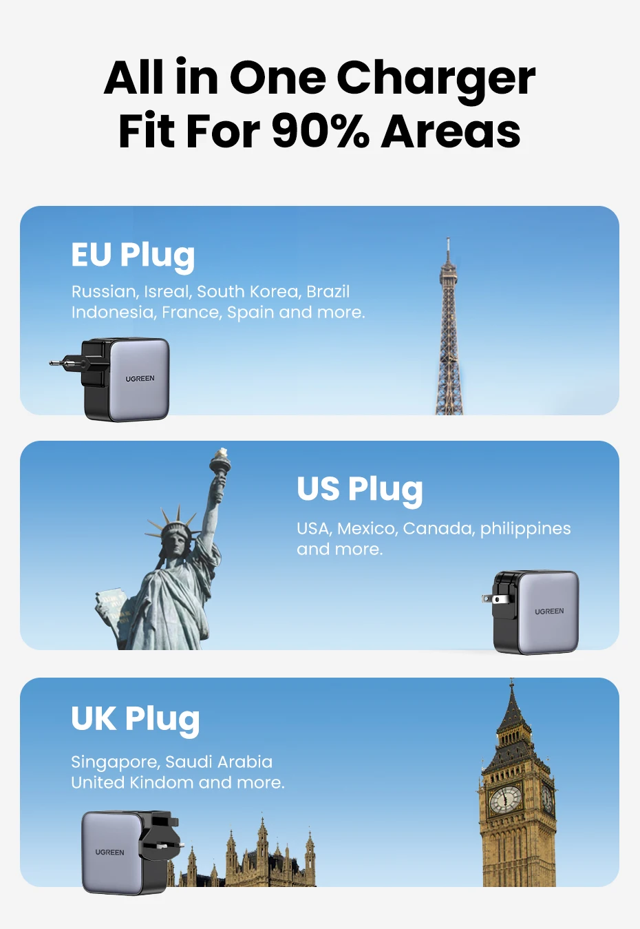 Comprar UGREEN-Adaptador de viaje GaN de 65W, cargador todo en uno con 1 puerto USB y 2 cargadores de pared tipo C para viajes de EE. UU., UE y Reino Unido