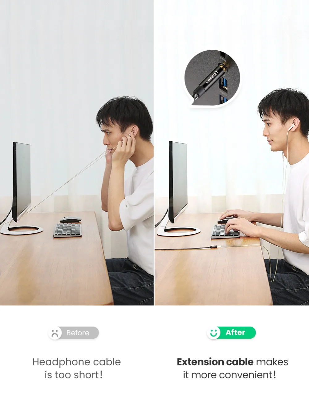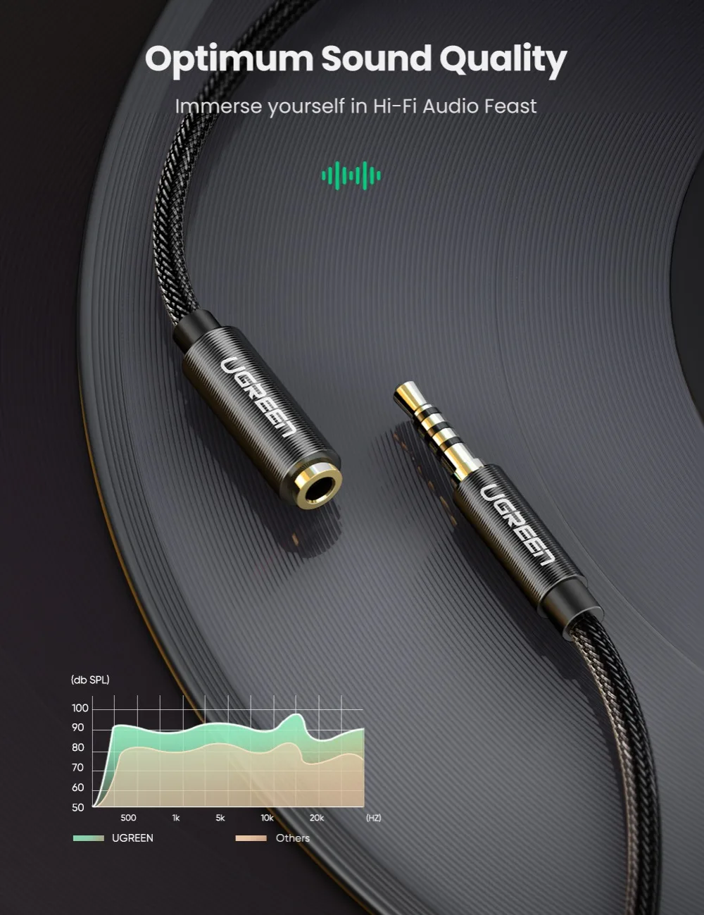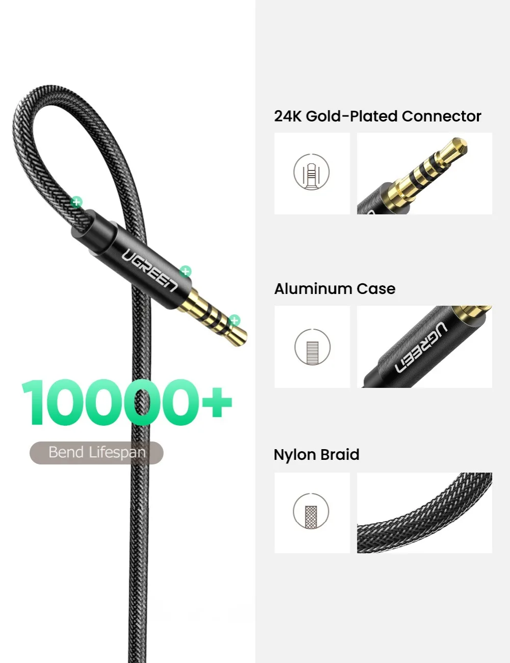 El cable extensor UGREEN de 3,5mm a 3,5mm está hecho de materiales de alta calidad, como una chaqueta de algodón suave trenzada de nylon, conectores chapados en oro resistentes a la corrosión, cubierta de aleación de aluminio pulido y cable de cobre esmaltado. Y este cable de extensión de auriculares Premium pasa por 10000 pruebas de tracción y flexión, que pueden probar fuertemente su larga vida útil y su increíble durabilidad.