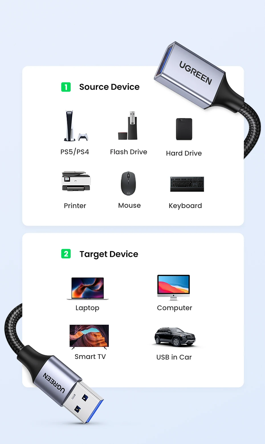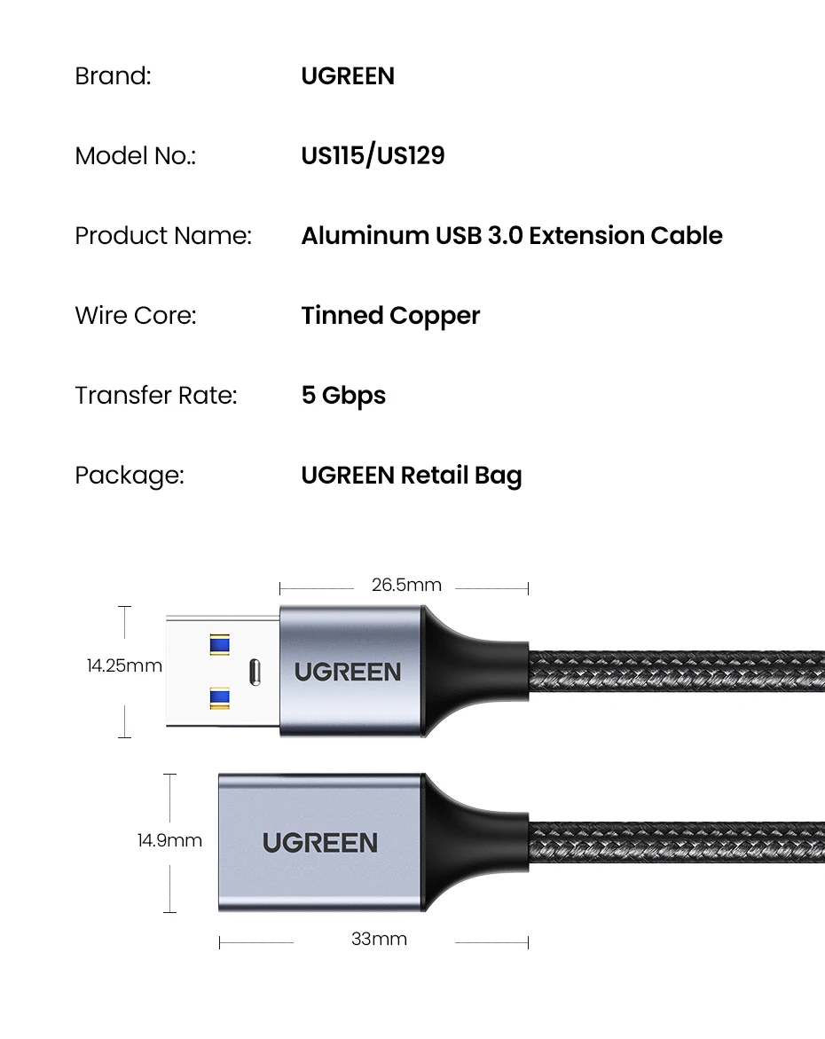 Marca: UGREENN. ° de Modelo: US115/US129Nombre del producto: Cable de extensión USB 3,0 de aluminioNúcleo de alambre: cobre estañadoVelocidad de transferencia: 5 GbpsPaquete: Bolsa de venta al por menor UGREEN