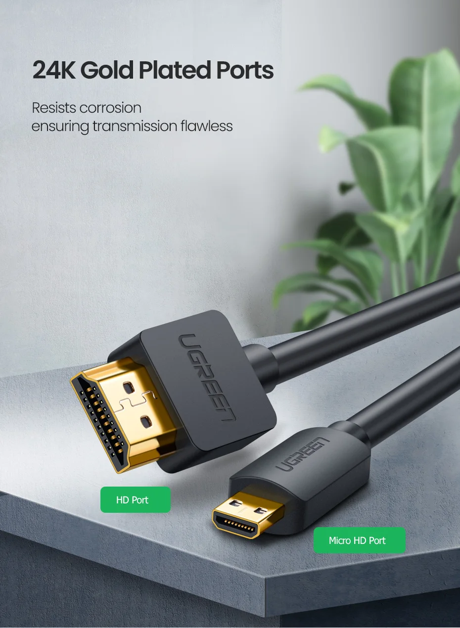 Hay 2 modelos disponibles, elija el modelo adecuado según sus necesidades:(1) Cable Micro HDMI: 1 m/1,5 m/2 m/3 m opcional(2) Cable Mini HDMI: 1 m/1,5 m opcionaldescripción general:El cable Ugreen Micro HDMI (macho a macho) es un cable de primera calidad que le permite transmitir audio y video desde una cámara, tableta o computadora portátil a través del puerto Micro HDMI a su HDTV o proyector con puerto HDMI. Le permite jugar en su pantalla HDTV grande o comparta vídeo y audio digital de alta definición junto con su familia y amigos.