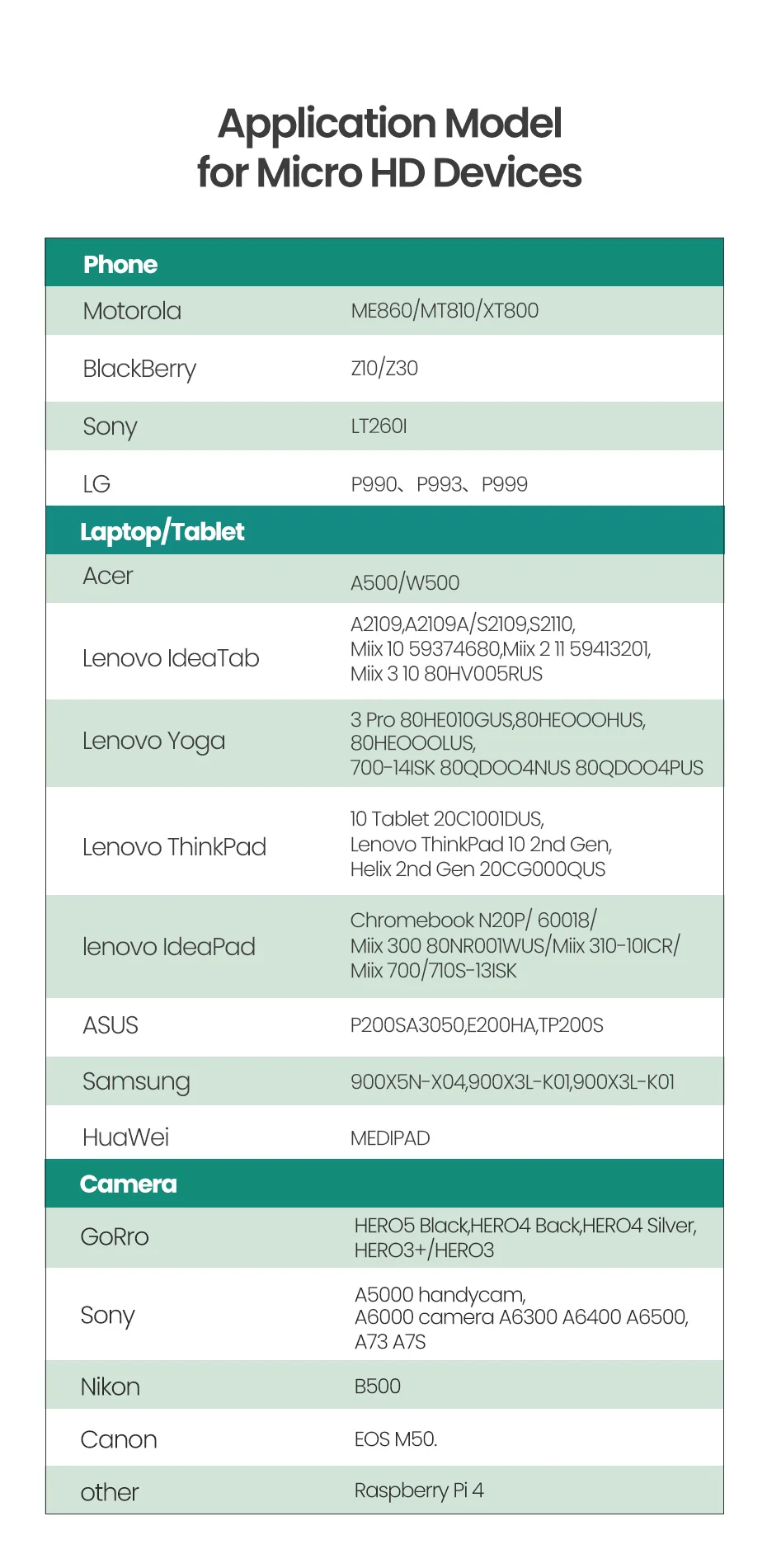 Especificación:1. Admite resolución máxima 4K 60Hz, 1440p, 1080p, 1080i, 720p, 480p y 480i2.Admite 3D, canal Ethernet y canal de retorno de audio3.Admite audio maestro True HD Dolby 7.1 y DTS-HD4.Compatible con muchos dispositivos con puerto micro HDMI (como GoPro Hero 7 Black, Hero 6 Black, Sony a5000 Handycam, tableta Lenovo IdeaPad Miix 300 10", Lenovo yoga 2 Pro, Raspberry Pi 4, etc.)