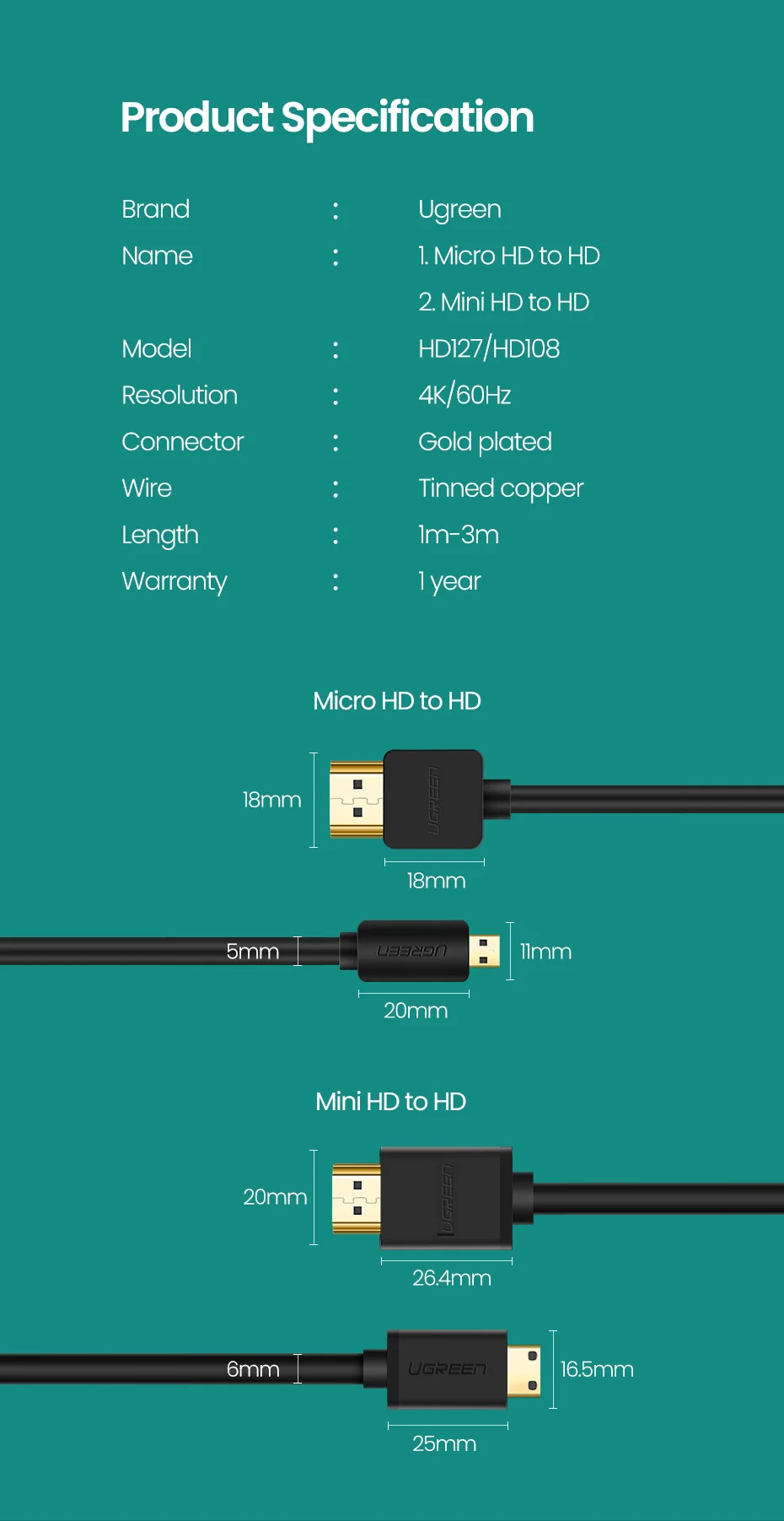 Hay 2 modelos disponibles, elija el modelo adecuado según sus necesidades:(1) Cable Micro HDMI: 1 m/1,5 m/2 m/3 m opcional(2) Cable Mini HDMI: 1 m/1,5 m opcionaldescripción general:El cable Ugreen Micro HDMI (macho a macho) es un cable de primera calidad que le permite transmitir audio y video desde una cámara, tableta o computadora portátil a través del puerto Micro HDMI a su HDTV o proyector con puerto HDMI. Le permite jugar en su pantalla HDTV grande o comparta vídeo y audio digital de alta definición junto con su familia y amigos.