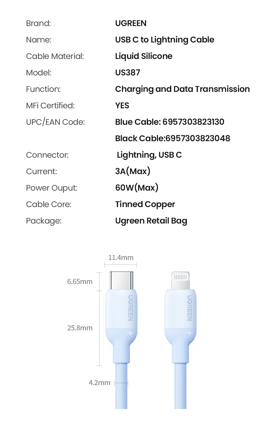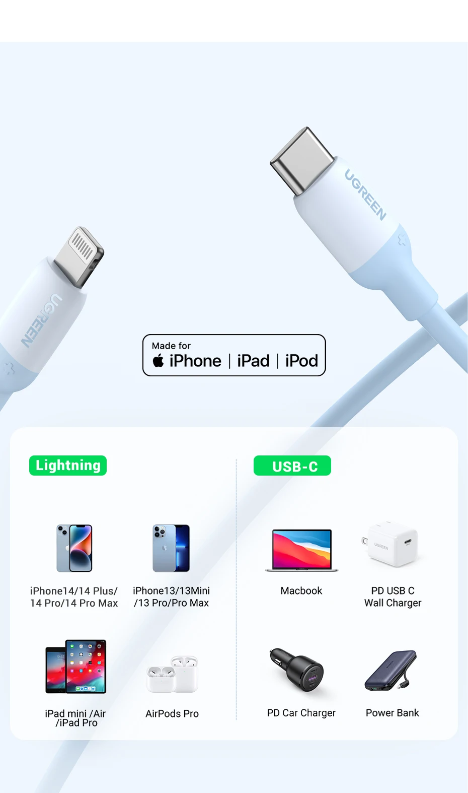 Comprar UGREEN-Cable USB C de silicona MFi a Lightning para iPhone 14, 13, 12 Pro Max, carga rápida para teléfono tipo C
