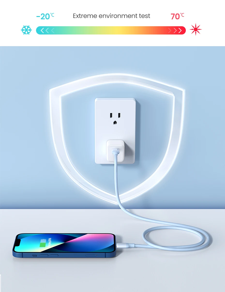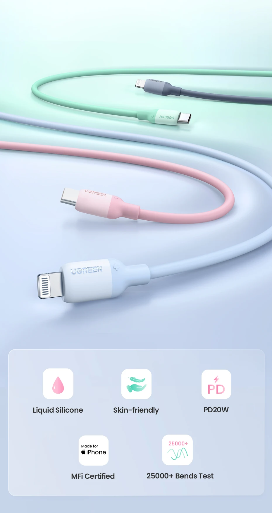 ● Silicona líquida ● Respetuoso con la piel ● PD20W ● Certificado MFi ● Más de 25000 pruebas de flexión