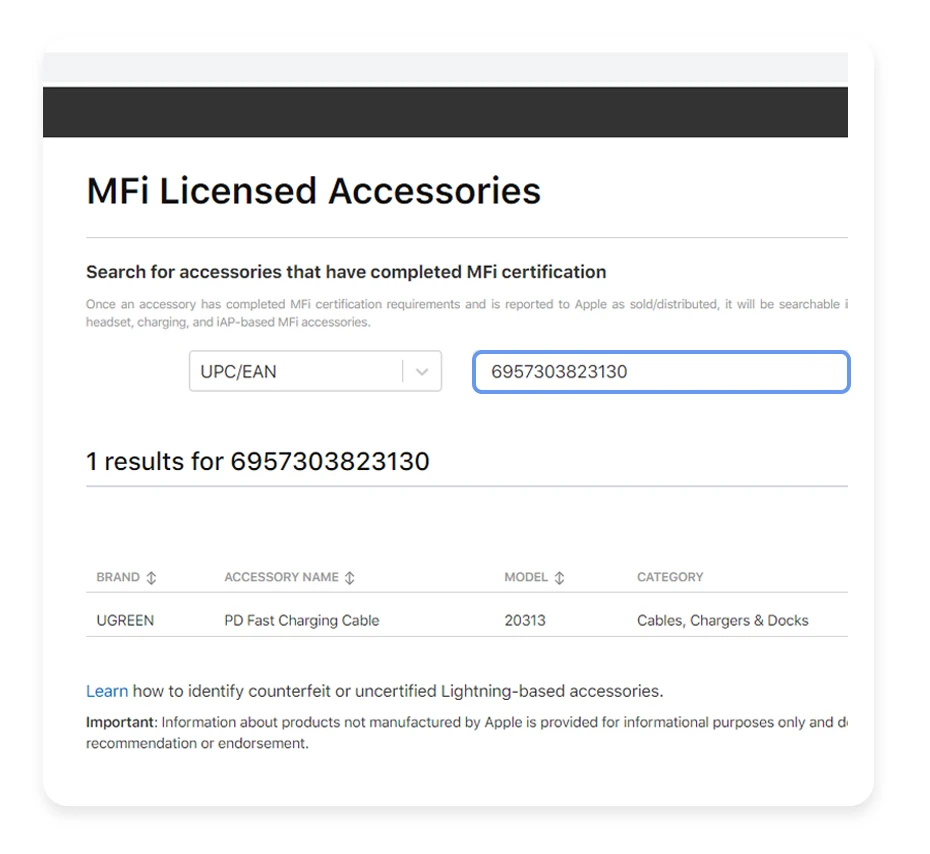 PPID de MFi Authority: 209693-546180, también puede verificar la información certificada MFi a través del número UPC/EAN de este cable Lightning: 6957303823130/6957303823048