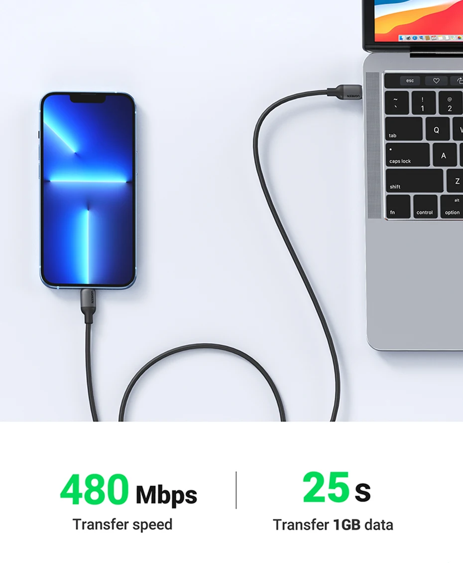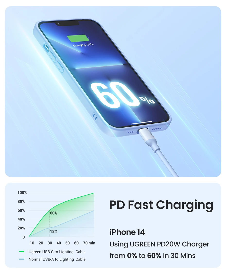 3 PD 20W carga rápida:El cable Lightning USB ugreen está integrado con el modo de carga rápida y el modo de carga lenta, que puede alimentar su iPhone de 0% a 60% solo en 30 minutos, mientras que después de 80%, el truco de carga comenzará a proteger tu iPhone de la sobrecarga o la sobrecorriente.