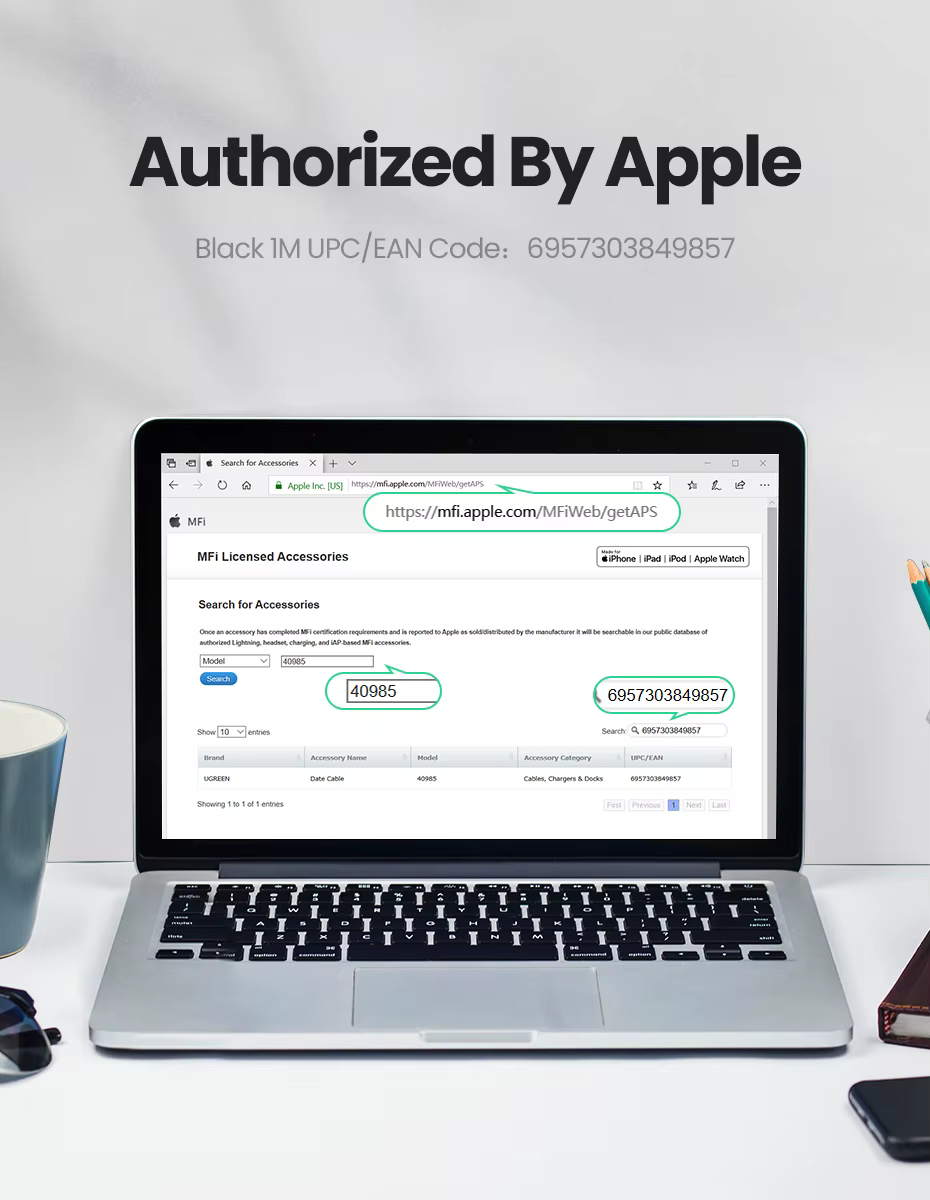 Autorizado por AppleDiga no al cable que no sea MFi, puede verificar la información certificada MFi a través del código UPC/EAN de este cable Lightning: 6957303849857