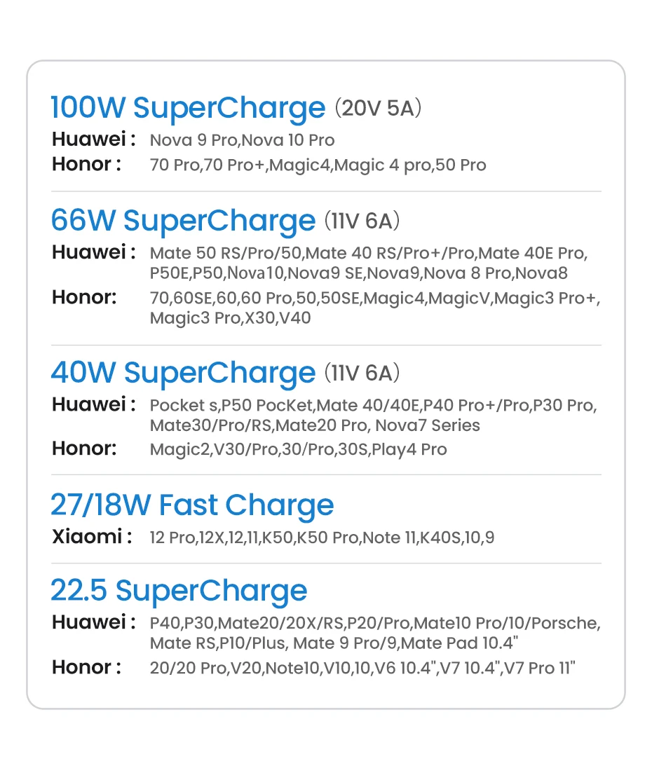 Cargador witn Huawei 66W, cargador Xiaomi 30W