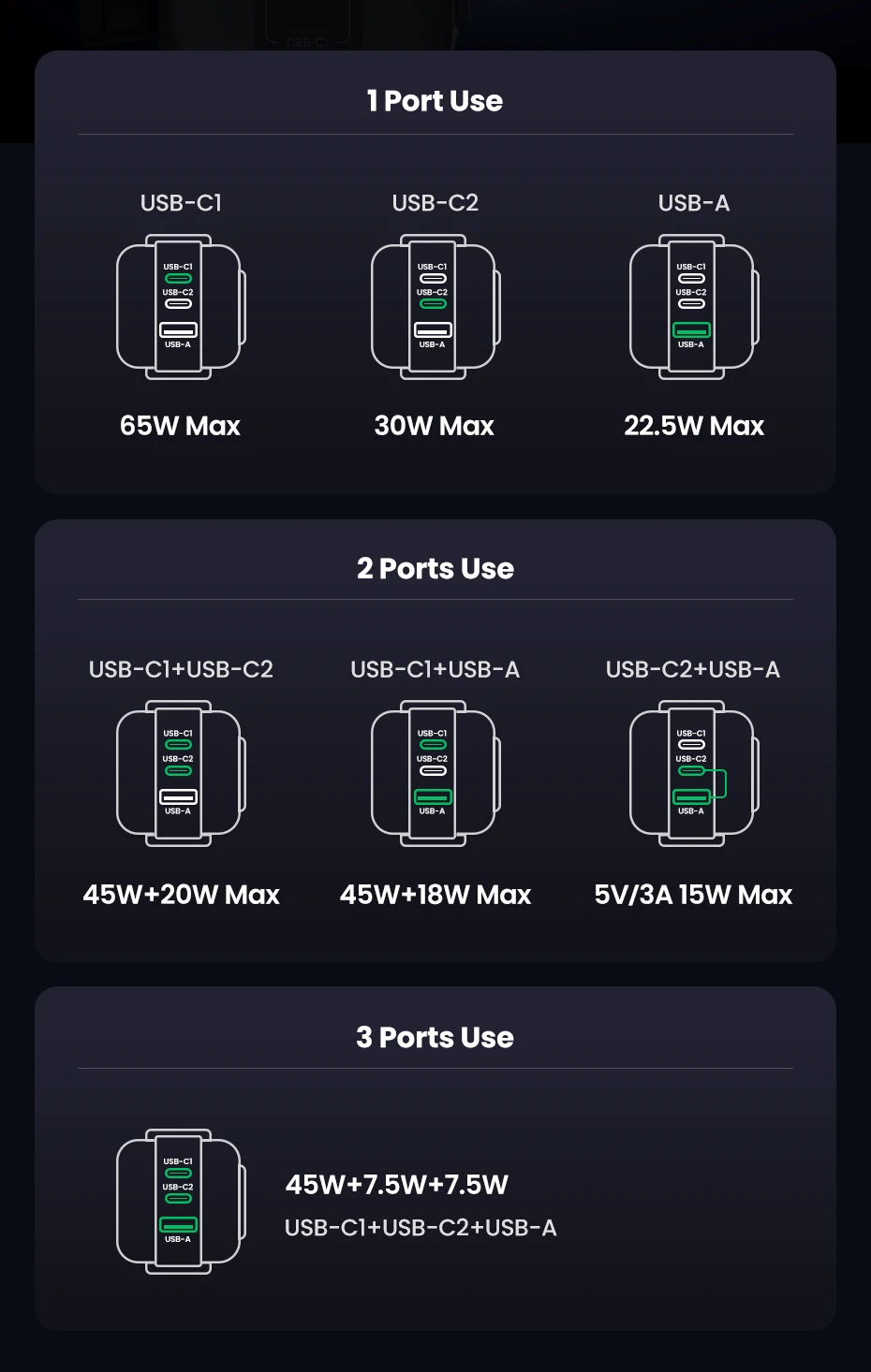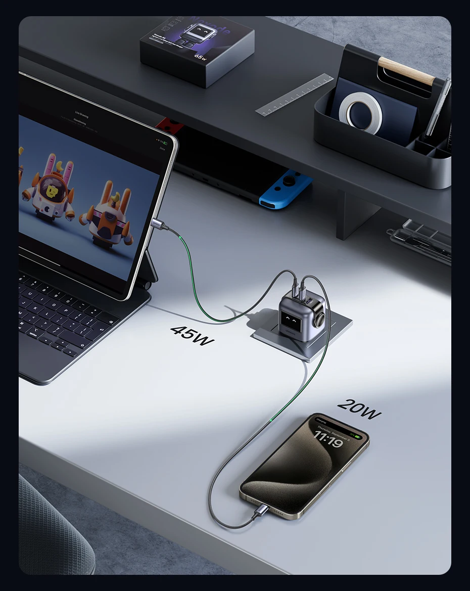 Excelente y hermoso cargador. 😍 Soporta protocolos de carga rápida. El primer puerto, Tipo C, admite la carga rápida 2.0 para teléfonos de la serie Samsung S, pero el cable debe soportar una potencia de 5A - 20V.