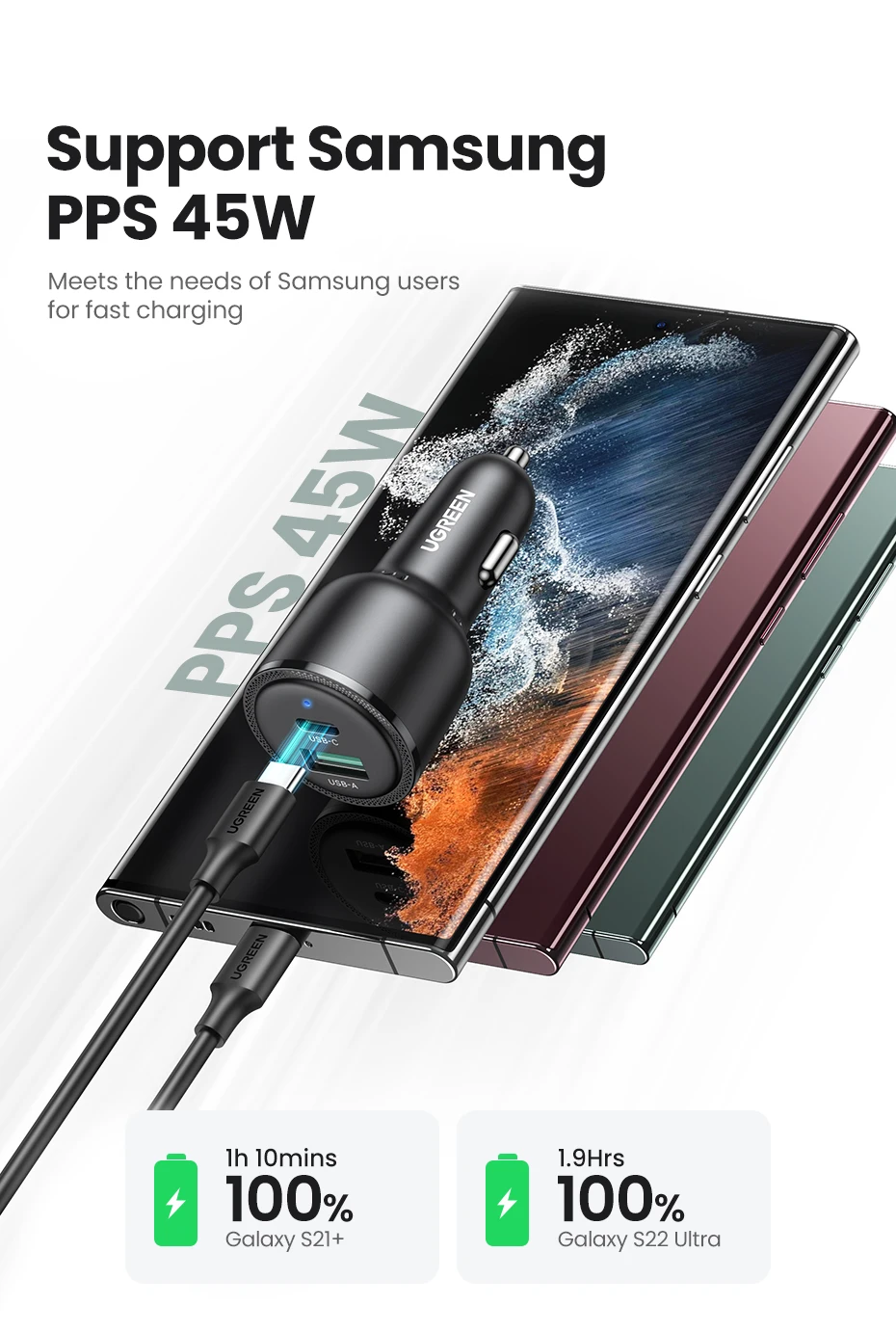Comprar UGREEN-cargador de coche para teléfono móvil, dispositivo de carga rápida PD QC 3,0 PPS 45W USB tipo C para iPhone 14 13 Samsung Xiaomi, novedad